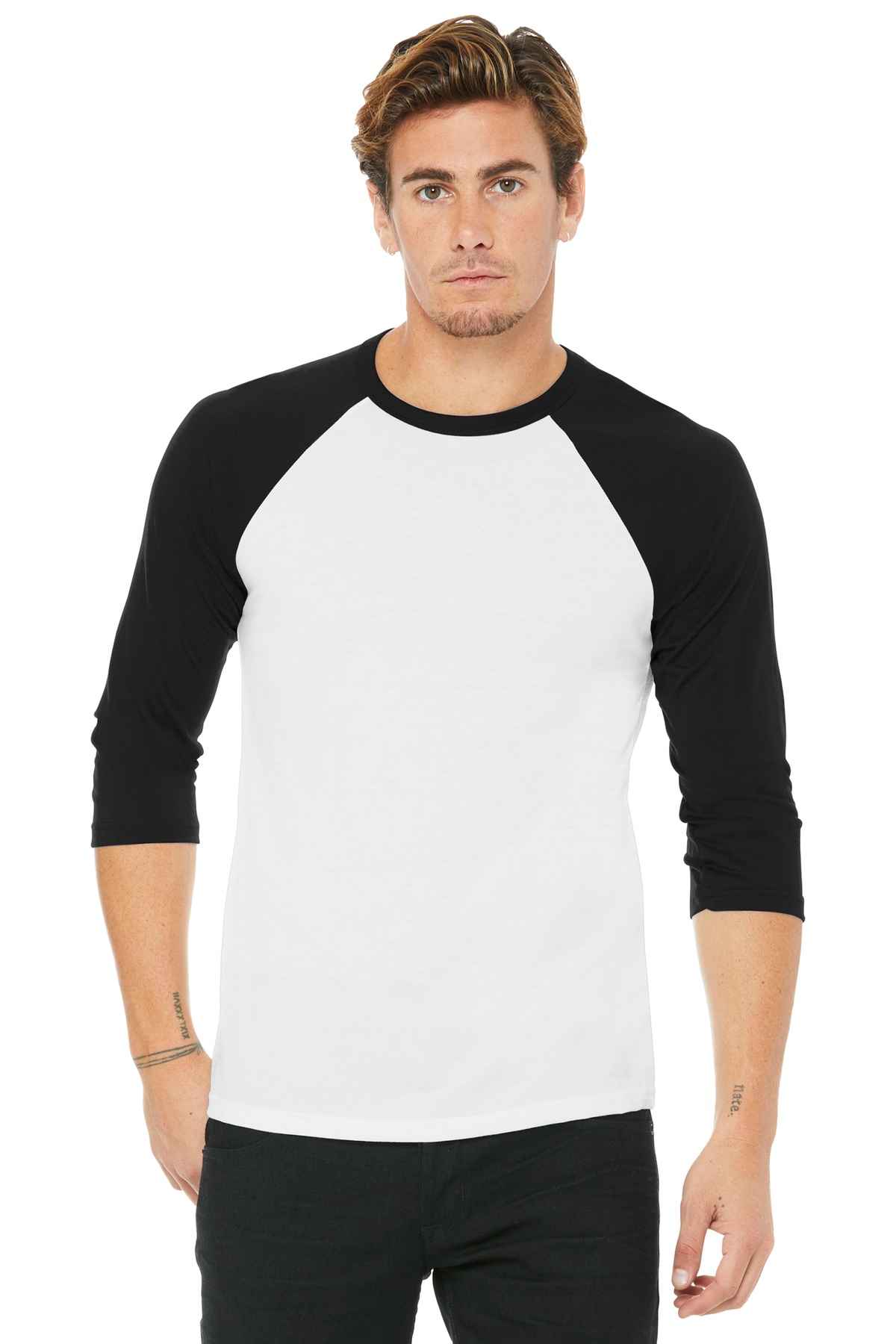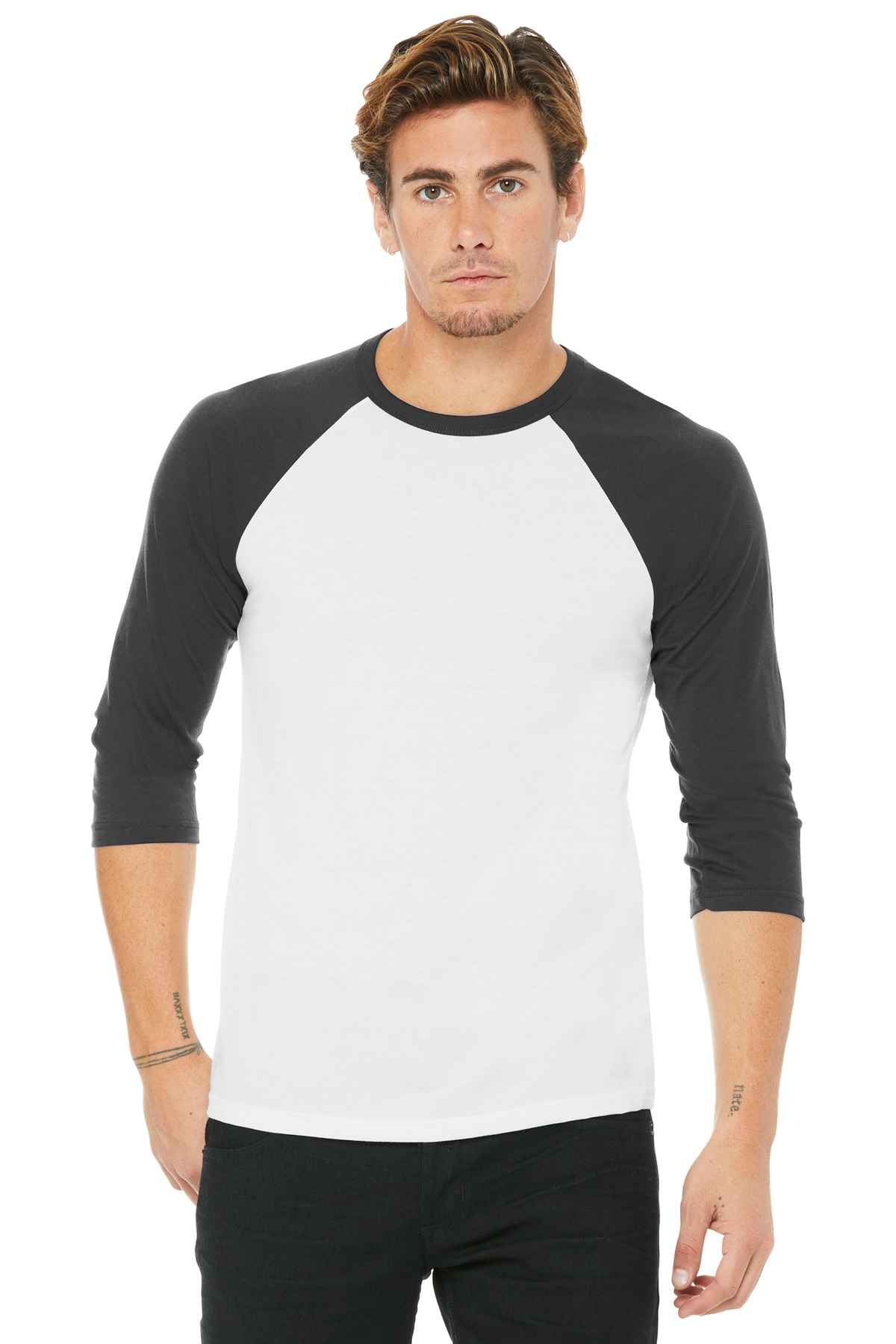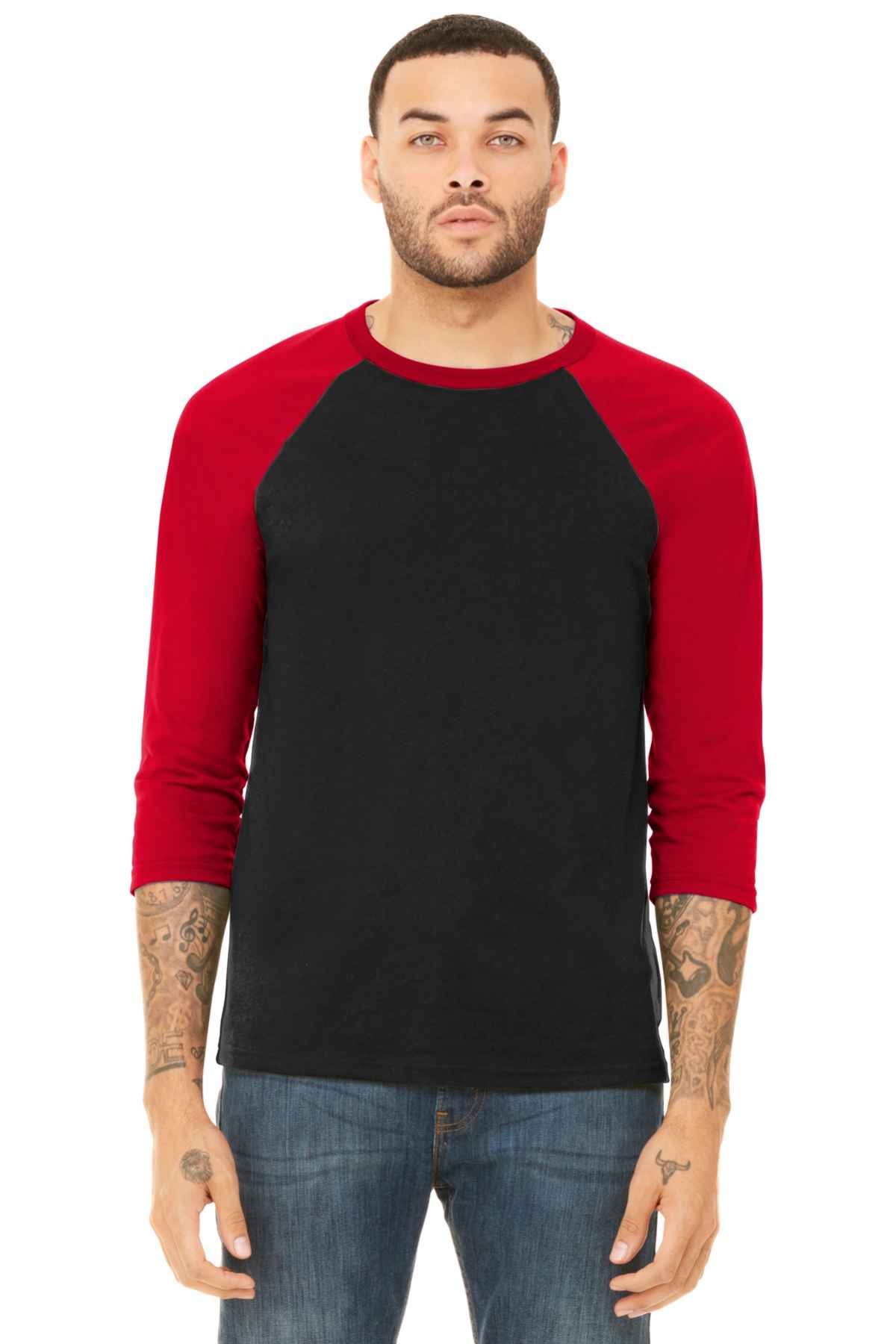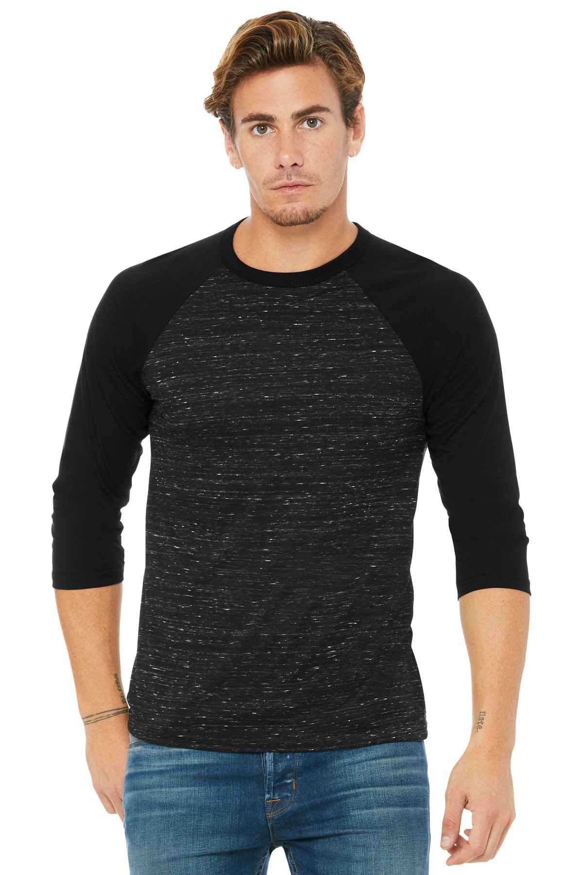 Retail fit Tear-away label Contrast raglan sleeves and neck trim Side seamed Solid Colorblock: 3.6-ounce, 52/48 Airlume combed and ring spun cotton/poly, 40 singles Black Heather: 90/10 Airlume combed and ring spun cotton/poly Marble Colorblock: 4-ounce, 91/9 poly/Airlume combed and ring spun cotton, 32 singles Triblend Colorblock: 3.8-ounce, 50/25/25 poly/Airlume combed and ring spun cotton/rayon, 40 singles