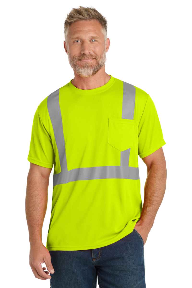 This breathable, moisture-wicking mesh tee delivers high visibility and on-the-job comfort. 4.1-ounce, 100% polyester birdseye mesh Durable, reflective 2-inch tape meets ANSI 107 requirements and provides 360-degree visibility on body 1x1 rib knit neck Back neck tape Left chest pocket