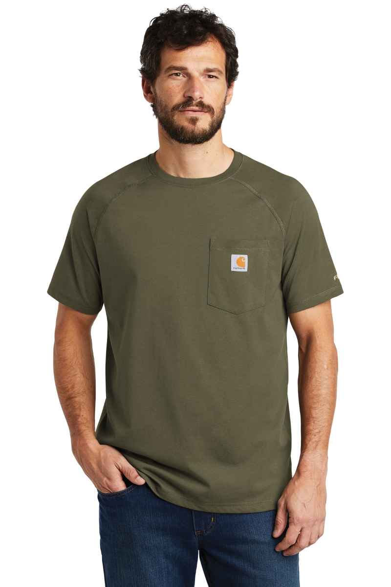 This tee fights sweat and stains and is built to work. Durable 5.75-ounce, 65/35 cotton/poly plaited jersey knit 59/41 cotton/poly (Heather Grey) 60/40 cotton/poly (Carbon Heather) FastDry ® technology wicks away sweat Stain Breaker ® technology releases stains Plaited knit construction so that poly is against the skin for moisture transportation while cotton on the face pulls moisture to the exterior Raglan sleeves to increase range of motion Left chest pocket Contrast neck tape Tagless neck label Smooth flatlock seams Carhartt label sewn on left chest pocket Carhartt Force ® labeling on left sleeve Relaxed fit