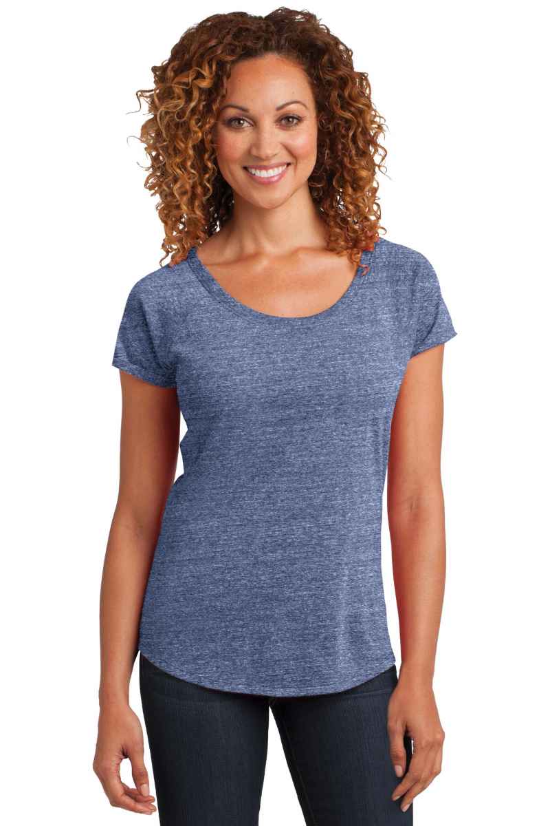 Heather texture makes this essential even more charming. | 4.4-ounce, 50/38/12 poly/ring spun cotton/rayon, 30 singles Rolled and tacked sleeves Due to the heat sensitivity of tri-blend fabrics, special care must be taken throughout the printing process. Consult your decorator or ink supplier for best printing practices.