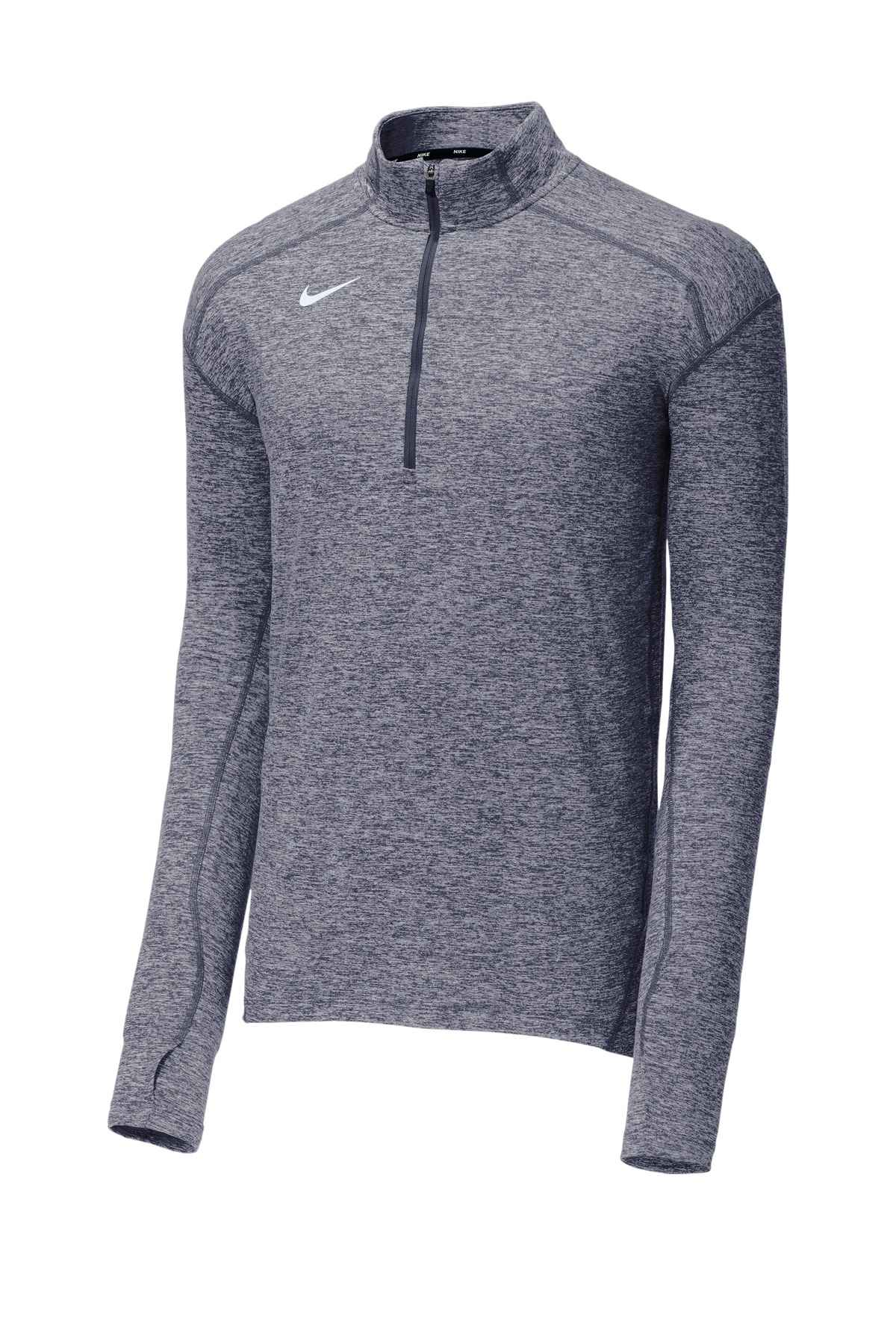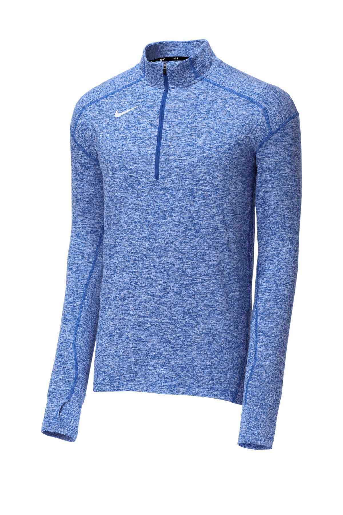 We're proud to offer this direct-from-retail Nike style, while supplies last. This best-selling Nike cover-up delivers all-utility warmth and comfort from the sweat-wicking fabric down to the thumbholes. The 1/2-zip design and mesh back panels enhance ventilation, while the stand-up collar and drop tail hem provide additional coverage. A contrast heat transfer Swoosh design trademark is on the right chest. Solids made of 5.5-ounce, 88/12 polyester/spandex jersey Dri-FIT fabric (front) and 5.3-ounce, 89/11 polyester/spandex Dri-FIT fabric (back). Heathers made of 5.75-ounce, 88/12 polyester/spandex jersey Dri-FIT fabric (front) and 5.3-ounce, 89/11 polyester/spandex Dri-FIT fabric (back).