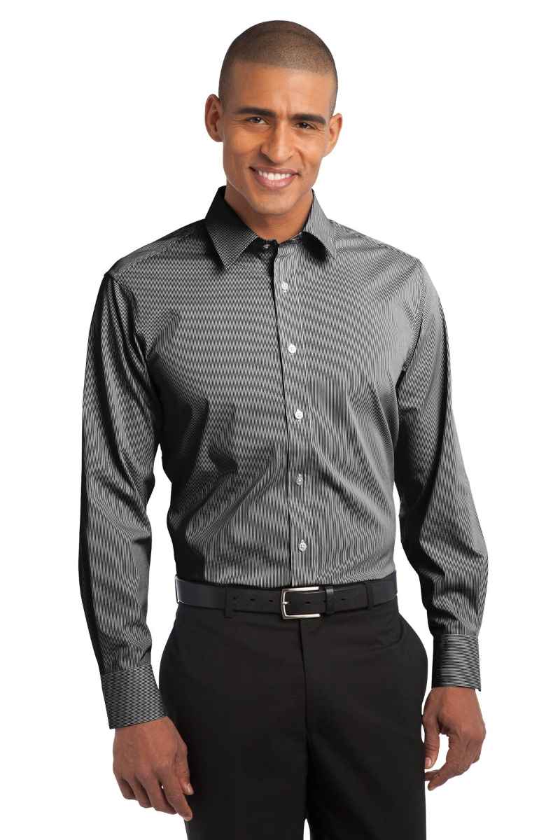 A fine stripe pattern and a stretchable blend make this modern poplin shirt a true workplace asset. Bias-cut details accentuate this always-professional look. | 3.4-ounce, 67/30/3 cotton/poly/spandex Open collar Outside back pleats Bias-cut details inside collar stand and under cuffs Adjustable, button-through sleeve plackets Shirttail hem