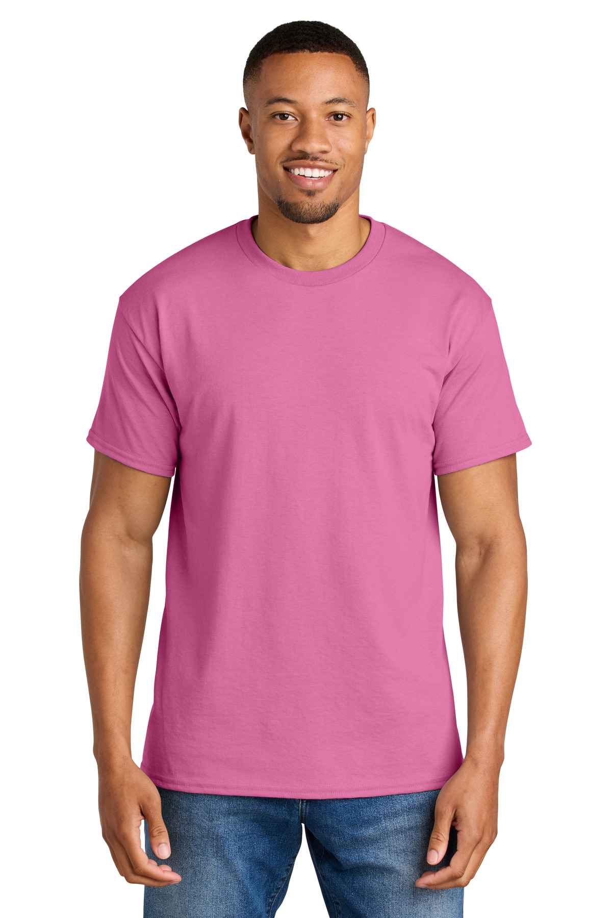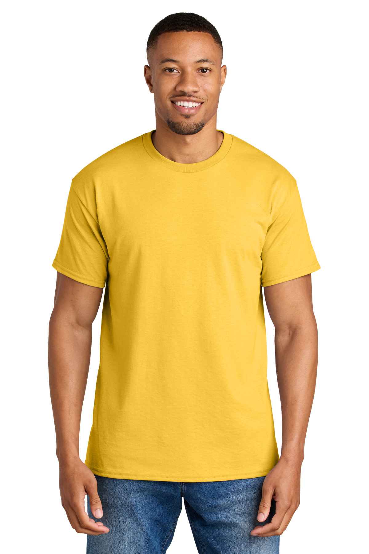 | 5.5-ounce, 50 US cotton/50 poly 65 US cotton/35 poly (Heathers) DryBlend moisture-wicking properties Recycled, high-performing black tear-away label Non-topstitched, classic width, rib collar Taped neck and shoulders Classic fit, seamless body Please note: This product is transitioning from tear-away labels to recycled, high-performing black tear-away labels. Your order may contain a combination of both labels.