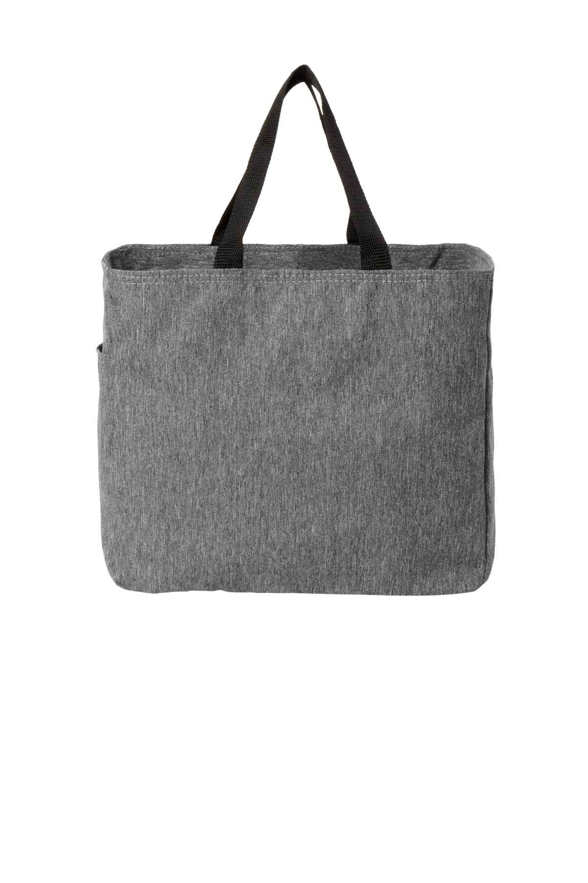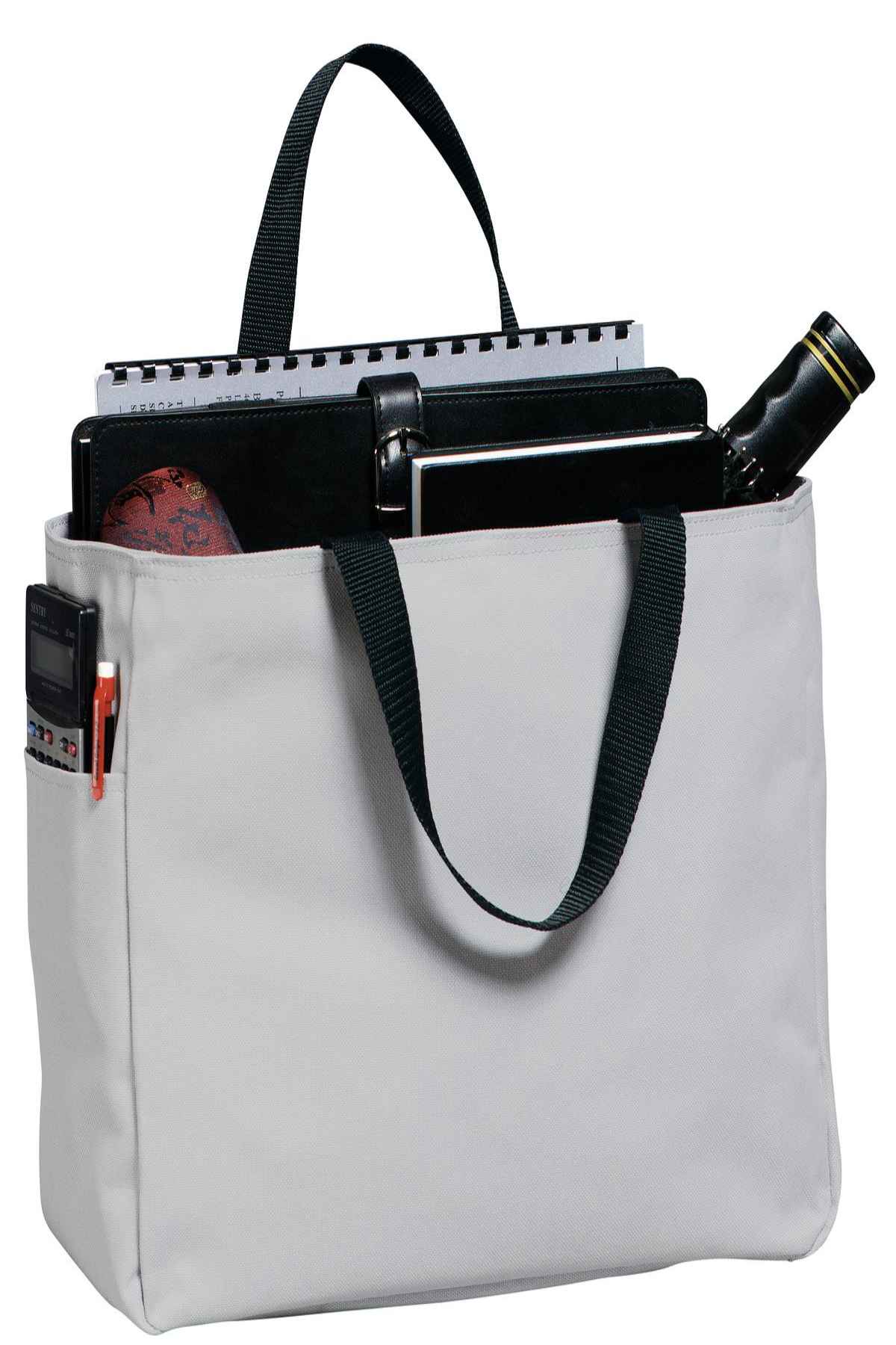 This durable tote comes in a rainbow of colors and is a tremendous value. | 600 denier polyester canvas Large main section with small interior self-fabric pockets Exterior side pocket Web handles Dimensions: 12'h x 12'w x 6.5'd, Approx. 936 cubic inches Note: Bags not intended for use by children 12 and under. Includes a California Prop 65 and social responsibility hangtag.