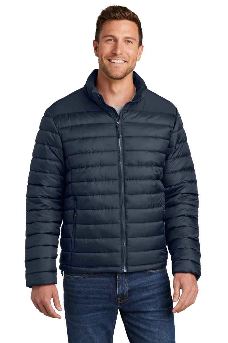 With horizontal baffles, a slight sheen and insulation that simulates down feathers, this is the newest puffy on the horizon. A water-resistant finish helps keep light rain out. 100% polyester shell and lining 90/10 polyester/spandex woven overlay on shoulders Molded center front zipper Elastic cuffs Port Pocket for decoration access Molded zippered hand pockets Insulation method: 10.4-oz. polyfill Water protection method: water-resistant finish on shell, PU coating on lining