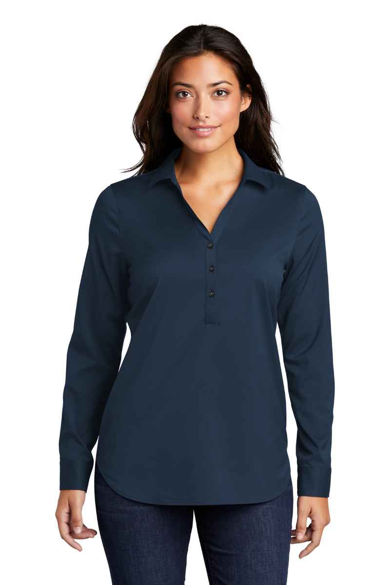 Comfort and performance meet classic corporate style. Odor-fighting, wrinkle-resistant and moisture-wicking, these looks have just the right amount of stretch to keep up with a busy day. 3.7-ounce, 93/7 poly/spandex Odor-fighting Wrinkle-resistant Moisture-wicking Open collar and neckline Longer tunic length Pearlized buttons Rounded adjustable cuffs Curved hem