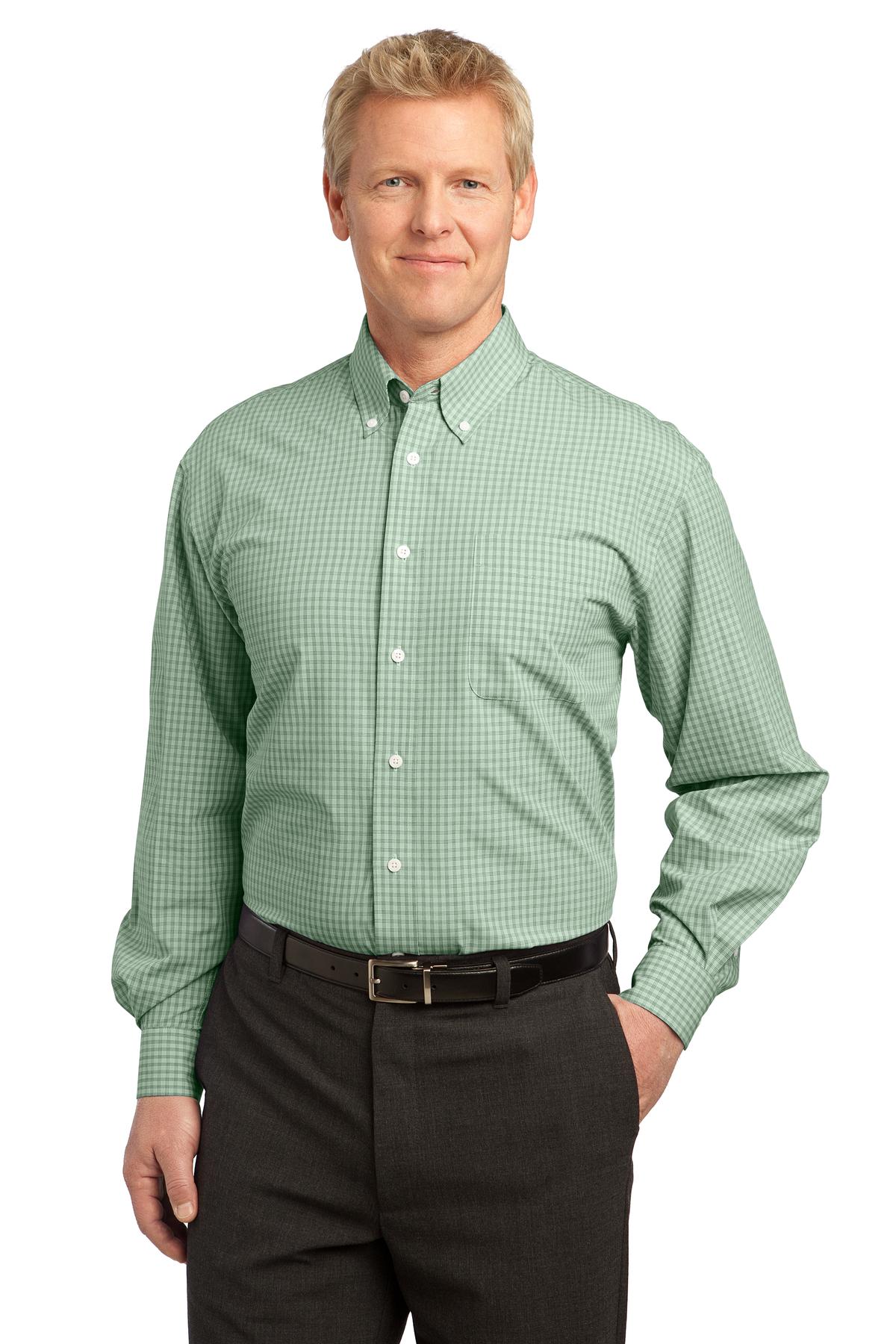 A not-too-bold plaid pattern offers a welcome break from a solid color. Designed for comfort and wrinkle-resistant convenience, this yarn-dyed poplin shirt is ideal for both dress and casual wear. 3.2-ounce, 55/45 cotton/poly Button-down collar Pearlized buttons Left chest pocket Back box pleat Rounded adjustable cuffs