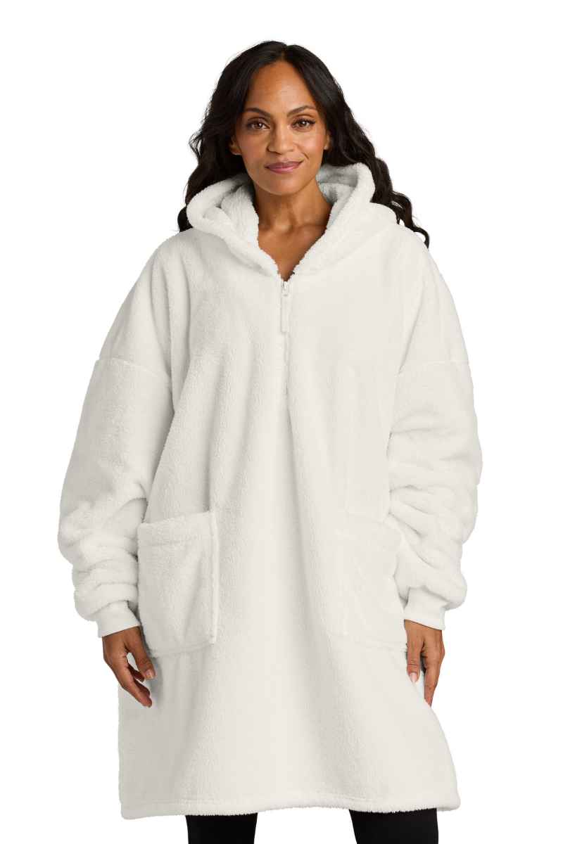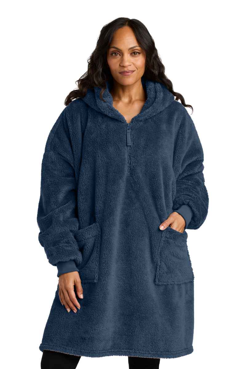 This two-sided brushed fleece poncho is simply fluffy and fun. Perfect for lounging, it offers a warm retreat any time of year. 7.9-ounce, 100% polyester fleece 1/2-zip popover style Generous hood Rib knit cuffs Patch pockets Drop tail hem Oversized fit