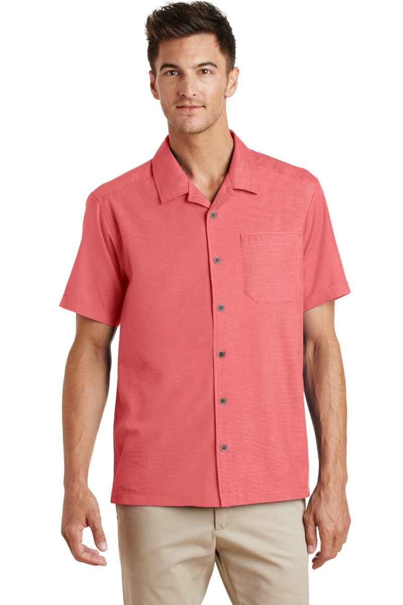 Lightweight and breathable, this modern take on the conventional camp shirt is designed for restaurants, resorts, spas and more. With a subtle dobby texture, this streamlined style becomes softer wash after wash. Plus, it performs by releasing stains and maintaining a wrinkle-free appearance that lasts long beyond your shift.| 3.2-ounce, 60/40 cotton/poly yarn-dyed dobby Camp style collar Faux horn buttons Left chest pocket with bias detail Turned-up sleeve cuff hems Side vents