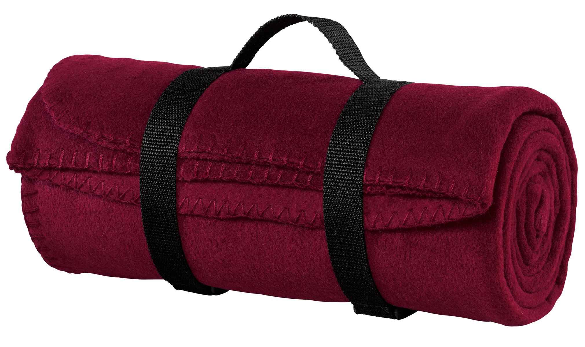 Our value blanket is soft on the budget, but sturdily constructed with a blanket stitch hem to guard against fraying. The easy-to-carry strap makes it perfect for events. | 13.3-ounce linear yard, 100% spun polyester fleece Dyed-to-match blanket stitch hem Web carrying strap with buckles Dimensions: 50' x 60'