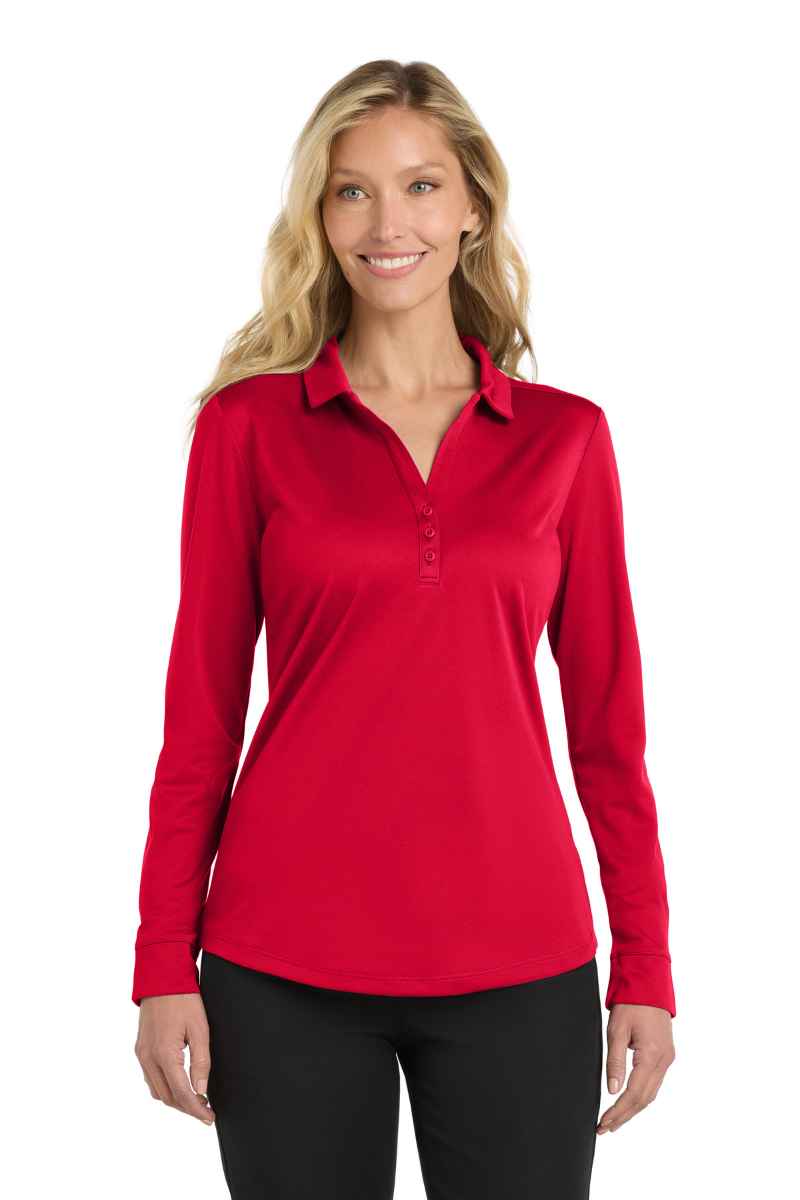 We took our legendary Silk Touch Polo and made it work even harder. The durable, easy care Silk Touch Performance Long Sleeve Polo wicks moisture, resists snags and thanks to PosiCharge ® technology, holds onto its color for a professional look that lasts. There¿s just no higher-performing polo at this price. 4-ounce, 100% polyester double knit with PosiCharge technology Self-fabric collar Tag-free label 3-button Y-neck placket Dyed-to-match buttons Self-fabric cuffs Curved hem