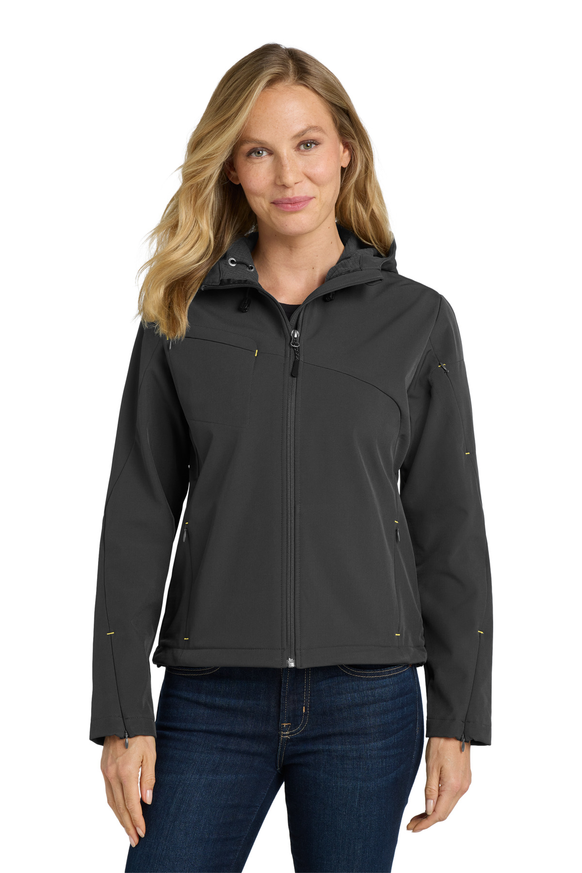 Our hooded soft shell stands up to the elementsÿ¿and stands out with texture and bar tack details. Highly breathable with stretch, this wind-resistant, water-repellent jacket is just right for the workday or the weekend. A hood and zippered sleeve vents add function and up-to-the-minute appeal. | 96/4 poly/spandex woven shell bonded to a water-resistant film insert and a 100% polyester microfleece 1000MM fabric waterproof rating 1000G/M 2 fabric breathability rating Hood with locking drawcord for adjustability Storm flap with chin guard Ergonomic zipper pulls Princess seams Zippered chest and sleeve pockets with contrast bar tack Front zippered pockets with contrast bar tack Open hem