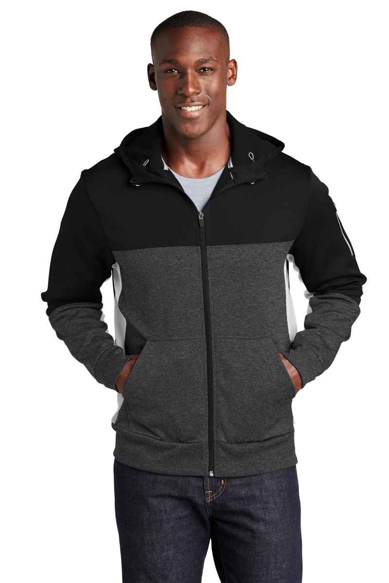 Snag-resistant with a matte finish and contrast color detailing throughout, this double-knit jacket is right on trend with moisture-wicking performance. | 7.1-ounce, 100% polyester Three-panel hood with drawcord and toggles Contrast neck and hood taping Set-in sleeves Contrast reverse coil zippered media pocket with headphone exit port Headphone holding loops at neck Reverse coil zipper Front pouch pockets Rib knit cuffs and hem * Please note: This product is transitioning from woven labels to tag-free labels. Your order may contain a combination of both labels