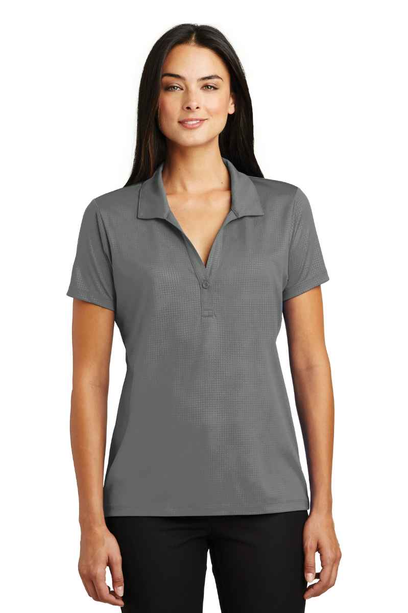 Tough enough to conquer moisture, snags and color bleed, this smooth polo also features a subtle, allover embossed geometric pattern. 4.7-ounce, 100% polyester jersey with PosiCharge technology and embossed pattern Self-fabric collar Tag-free label 1-button Y-placket with dyed-to-match rubber button Set-in, open hem sleeves