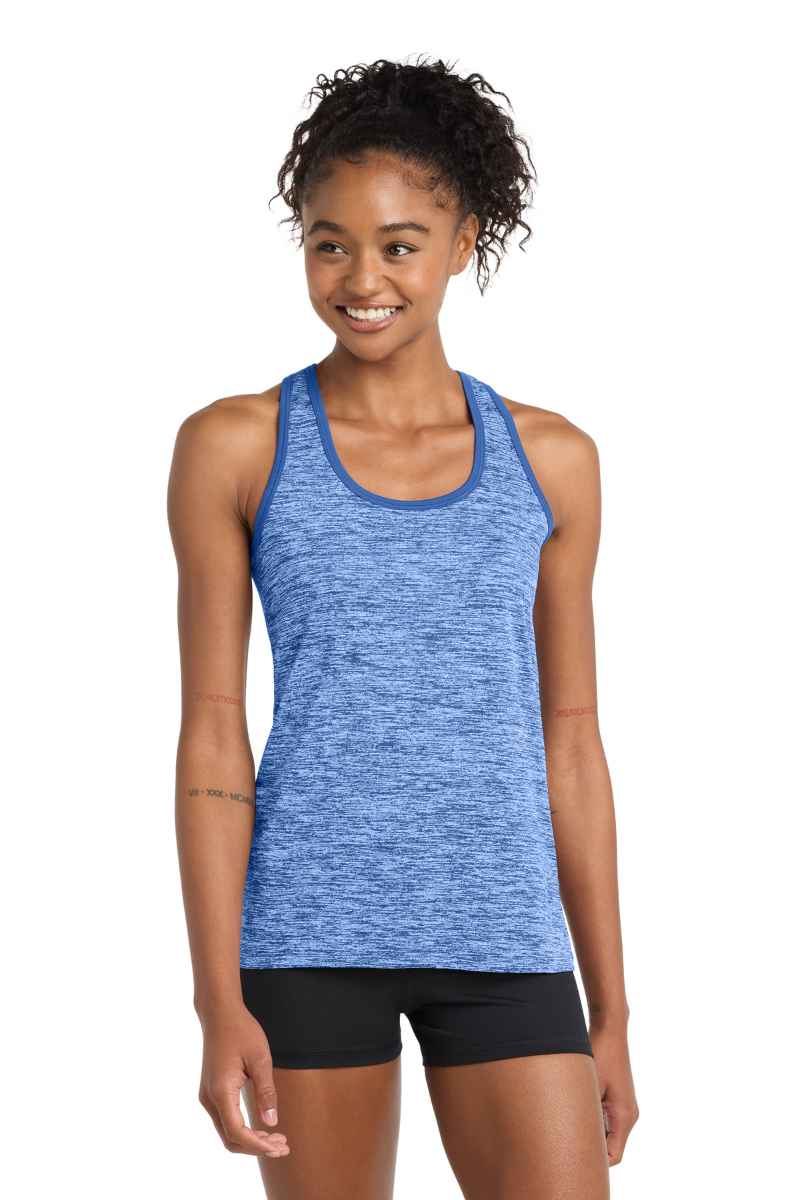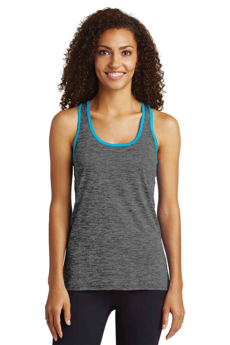 Our color-locking tank has a soft hand, wicks moisture, and combines colors and bindings at the neck and armholes. 4.1-ounce, 100% polyester jersey with PosiCharge technology (Electric Heather) 3.8-ounce, 100% polyester interlock with PosiCharge technology (trim) Removable tag for comfort and relabeling Curved drop tail hem