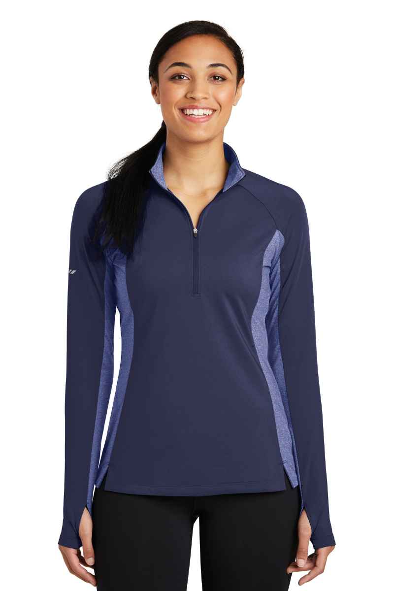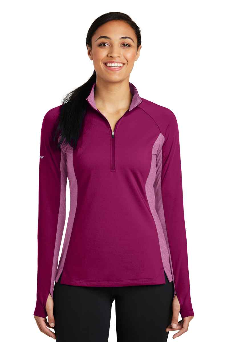By mixing heather with a solid color and adding reflective hits, this moisture-wicking pullover has a technical look plus plenty of stretch for easy movement. 6.8-ounce, 90/10 poly/spandex jersey Soft-brushed backing Tag-free label Reflective details on right sleeve and lower back Feminine curved and blocked design details on back Cadet collar Reverse coil zipper Princess seams Raglan sleeves Open cuffs and hem Thumbholes to keep hands warm Drop tail hem