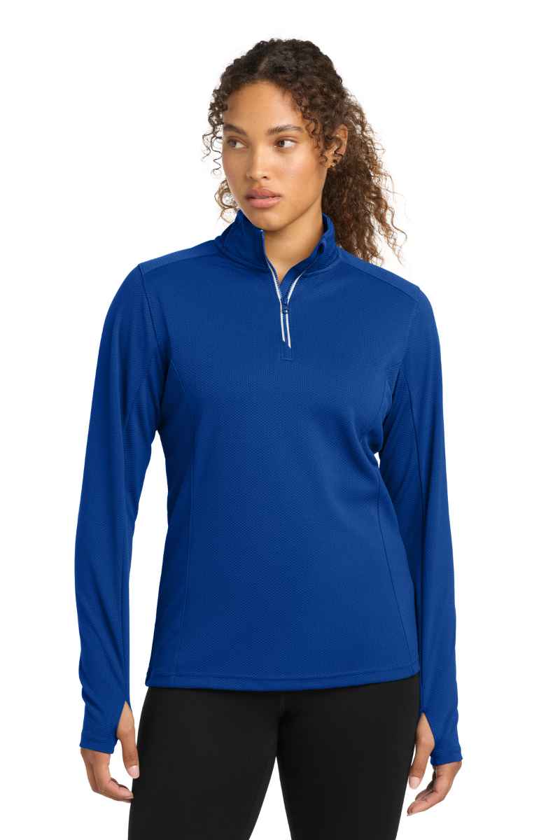 This mid-weight pullover has an unbeatable textured look with contrast zipper taping. Plus, it performs by wicking moisture. | 100% polyester Cadet collar Tag-free label Taped neck Dyed-to-match Vislon zipper and pull Silver zipper tape Angled chin guard for additional comfort Set-in sleeves Thumbholes to keep hands warm Front and back princess seams Open cuffs and slight drop tail hem Due to the nature of 100% polyester performance fabrics, special care must be taken throughout the printing process.
