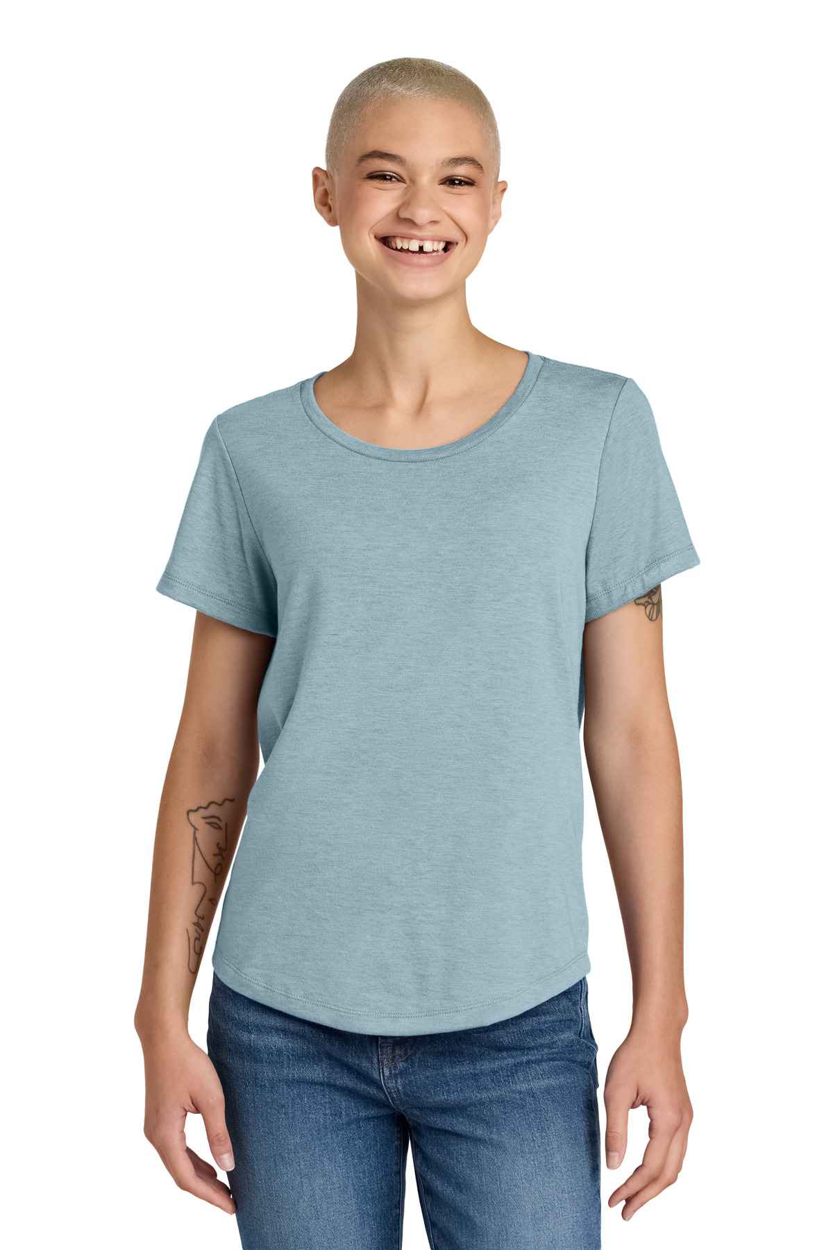 Feel your impact in this crazy-soft sustainable tee that uses an equivalent of up to 6 recycled plastic water bottles. 4.2-ounce, 50% recycled polyester, 25% organic ring spun cotton, 25% modal This product's carbon footprint has been measured and reduced through a combination of preferred materials and investing in carbon offset projects though the ClimeCo Certified Product Program 1x1 rib knit scoop neck Shoulder-to-shoulder taping Side seams Shaped hem Recycled tear-away label