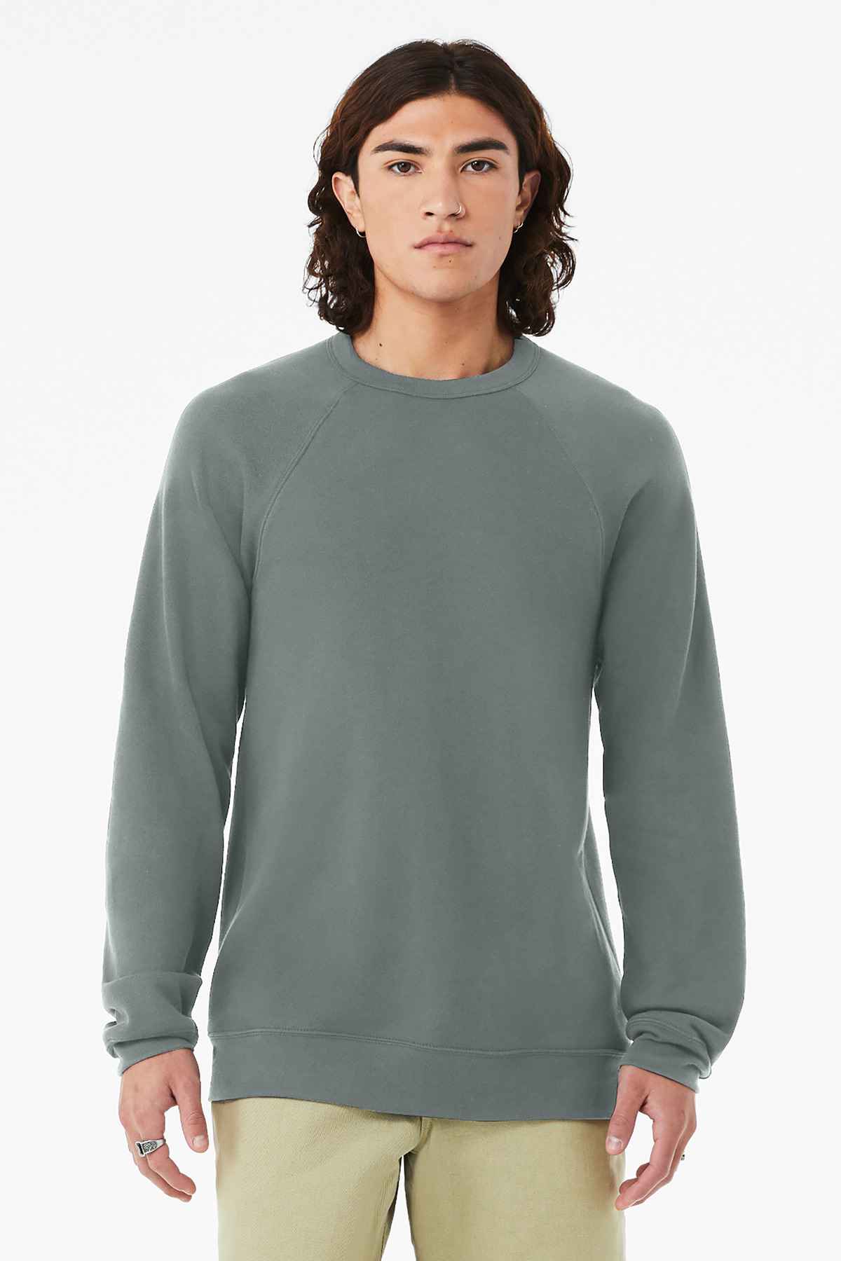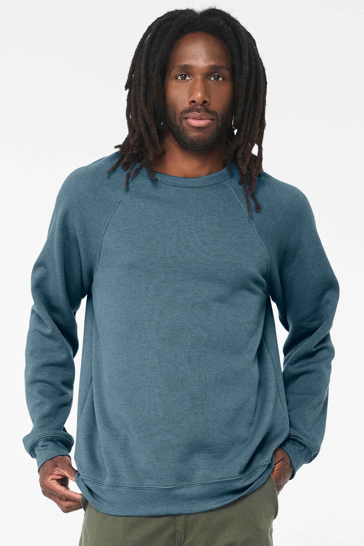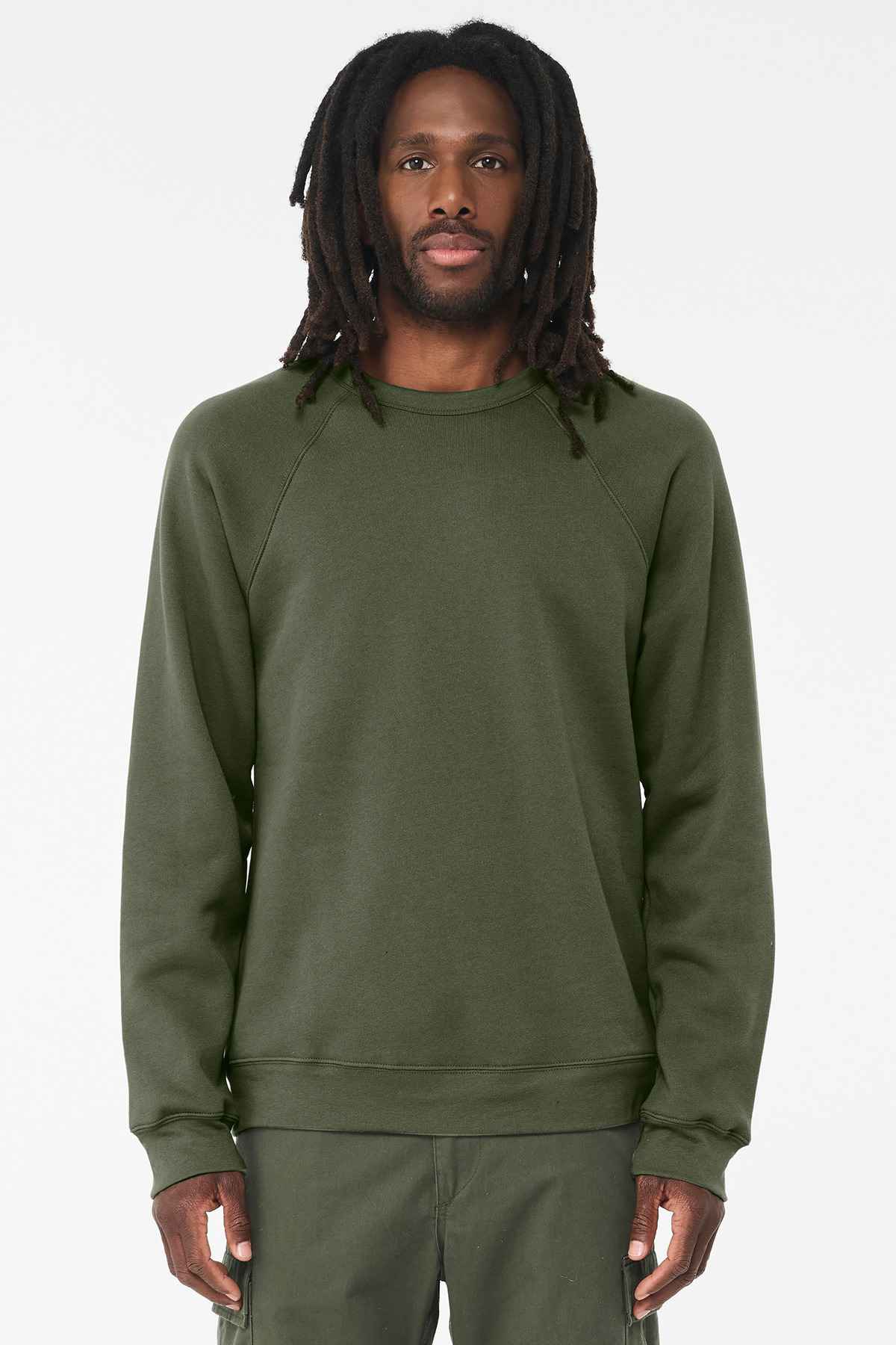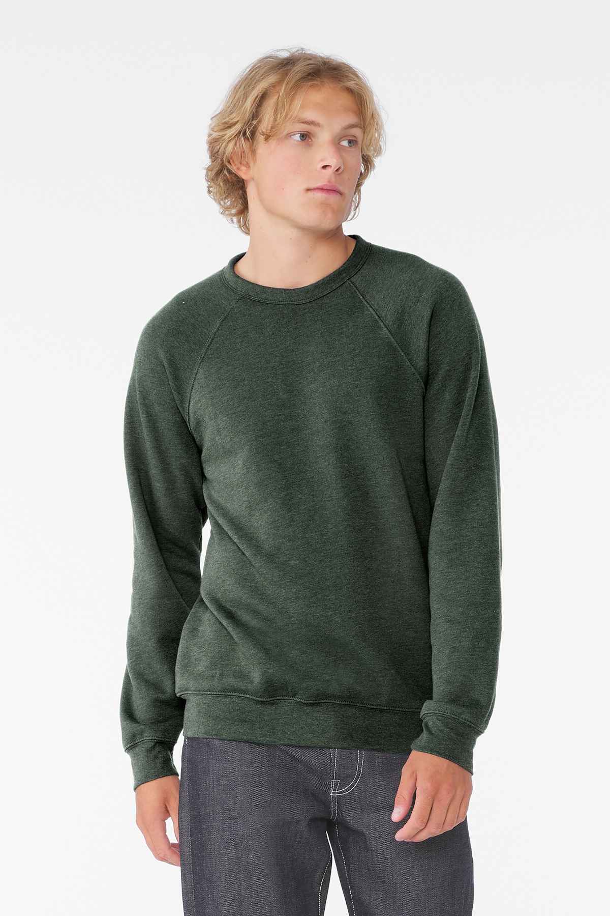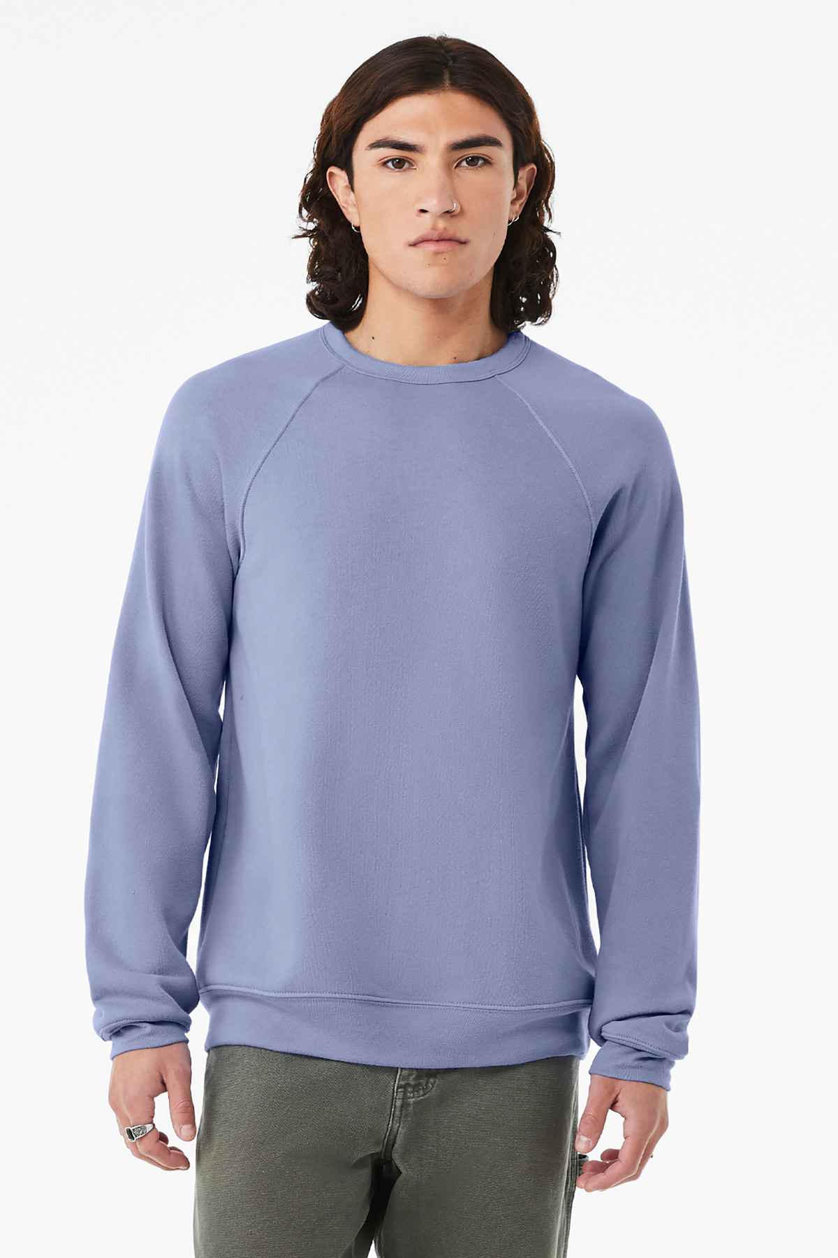 Retail fit Tear-away label Raglan sleeves Side seamed Rib knit cuffs and hem Solid Colors and Heather Colors: 8-ounce, 52/48 Airlume combed and ring spun cotton/poly fleece, 32 singles Triblend Colors: 8-ounce, 50/37.5/12.5 poly/Airlume combed and ring spun cotton/rayon, 32 singles Athletic Heather: 8-ounce, 90/10 Airlume combed and ring spun cotton/poly fleece, 32 singles