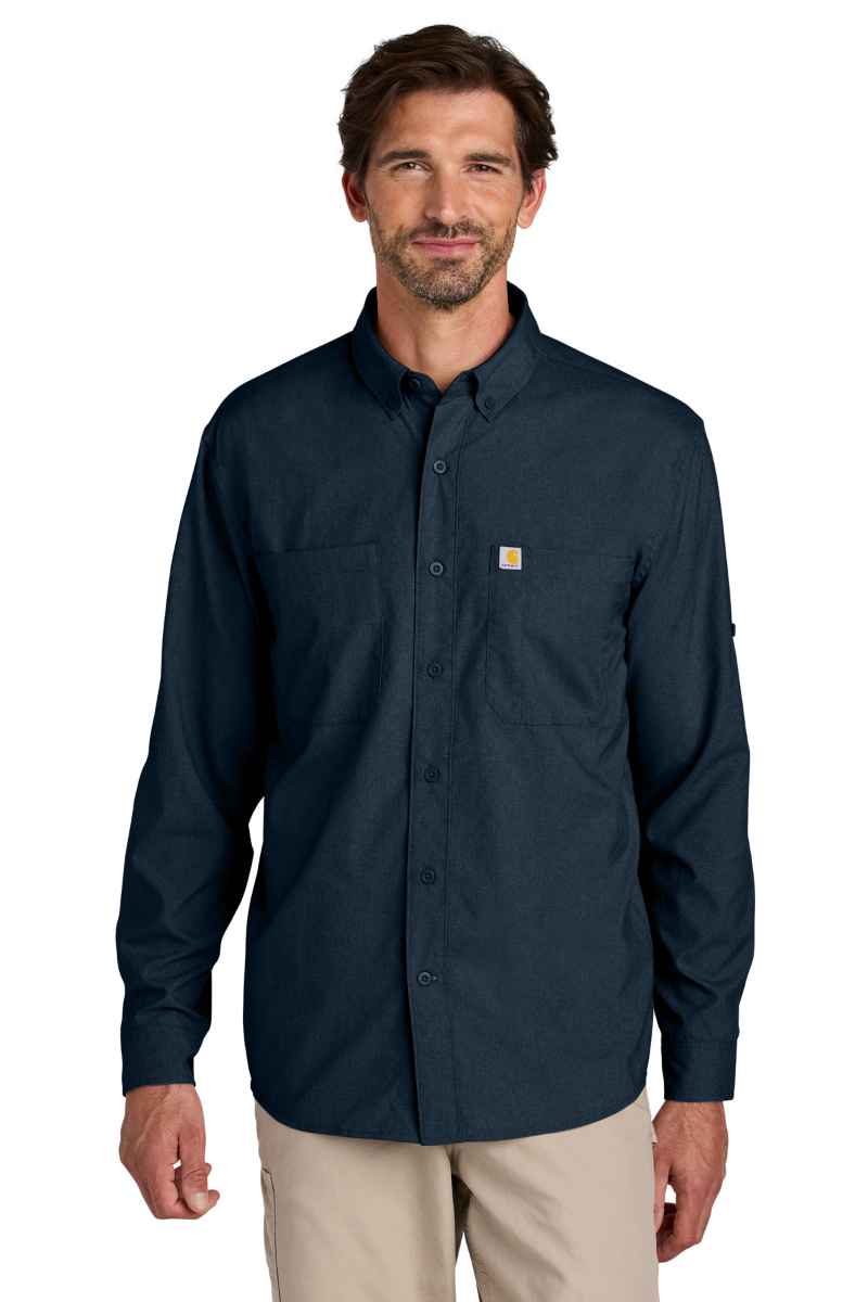 Outwork everything under the sun. Engineered with an emphasis on sweat-fighting and sun protection, this work shirt is ideal for the warmest days. 2.9-ounce, 71/29 polyester/nylon chambray Sun Defender UPF 50+ UV protection Carhartt Force ® works harder to fight sweat, dry fast and stop odor FastDry ® technology wicks away sweat to keep you cool Rugged Flex ® technology for ease of movement Button-down collar Mesh-lined vent at center back for flow-through ventilation Two chest pockets with a pen stall Carhartt label sewn on left chest pocket Roll sleeves with button tabs Two-button adjustable cuffs with extended plackets Relaxed fit