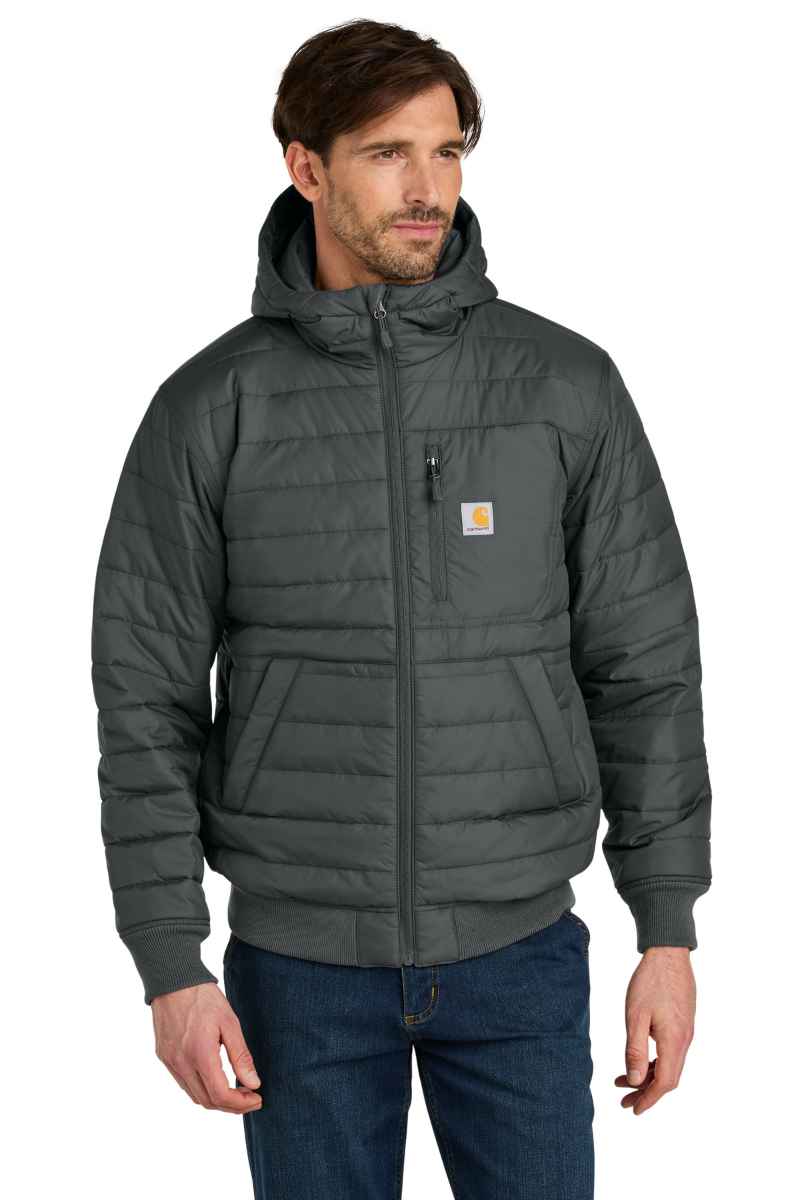 Tougher than the weather, this water- and wind-resistant jacket has insulation for warmth and is built for enhanced durability. 1.8-ounce, 100% nylon CORDURA ® shell Rain Defender ® durable water repellent (DWR) Wind Fighter ® technology tames wind Nylon lining quilted to 120-gram, 100% polyester insulation for warmth Adjustable hood Reverse coil center front zipper Left chest zippered patch pocket Two hand pockets with hidden snap closures Two interior pockets: one zippered, one hook and loop closure Rib knit cuffs and hem Carhartt-strong, triple-stitched main seams Carhartt label sewn on chest pocket Relaxed fit **