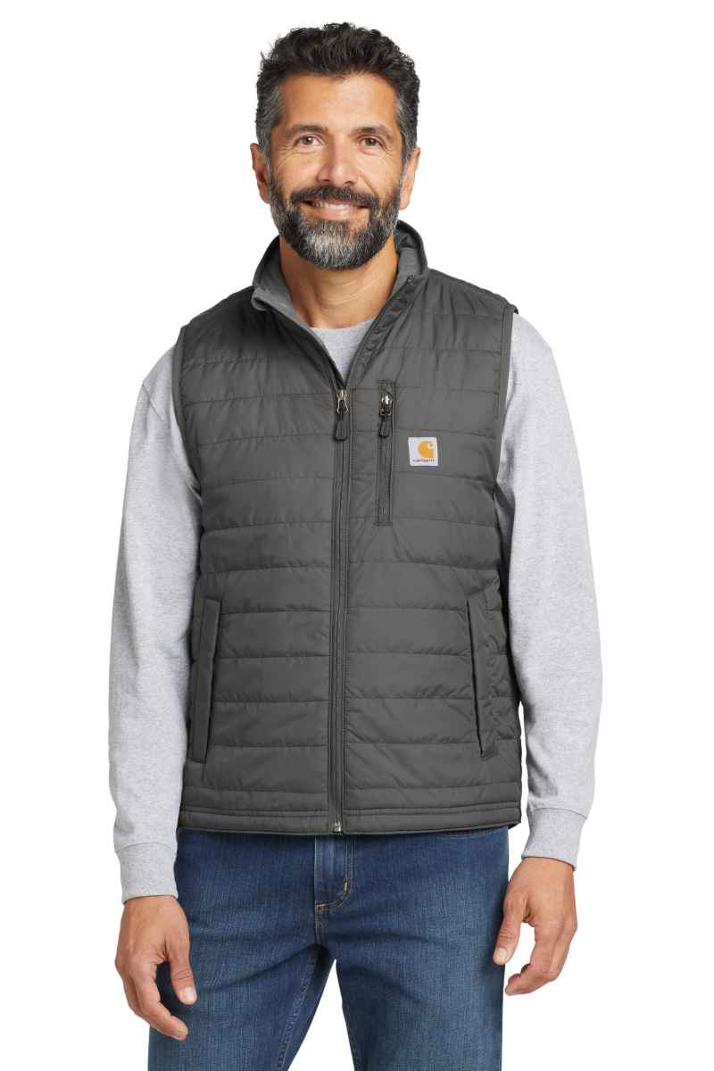 When it's just cold enough to call for core warmth, this insulated vest has you covered as a lightweight, water-repellent layer. 1.75-ounce, 100% nylon Cordura ® shell Rain Defender ® durable water repellent Wind Fighter ® technology tames wind Nylon lining quilted to 100-gram, 100% polyester insulation for warmth Reverse coil center front zipper Zip-through collar Left chest map pocket with reverse coil zipper Two hand pockets with hidden snap closures Two interior pockets: one zippered, one hook and loop closure Drawcord adjustable drop tail hem Carhartt-strong, triple-stitched main seams Carhartt label sewn on chest pocket Relaxed fit
