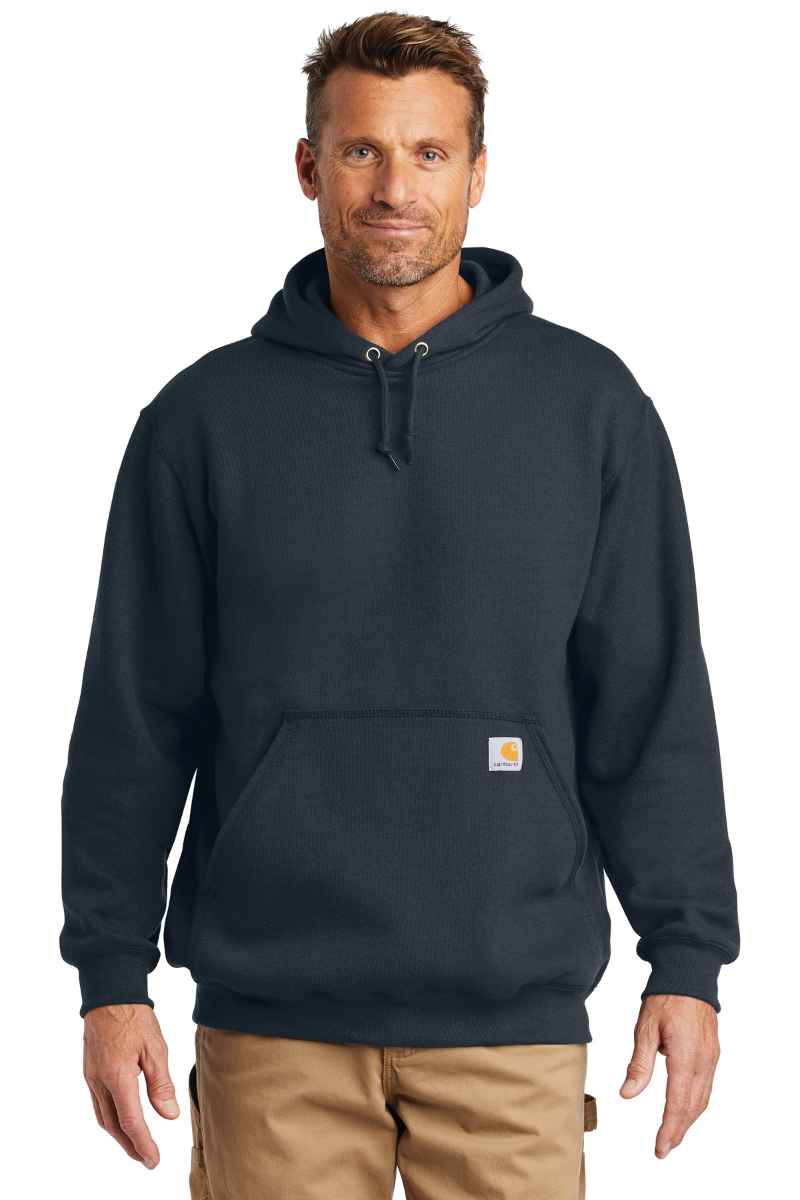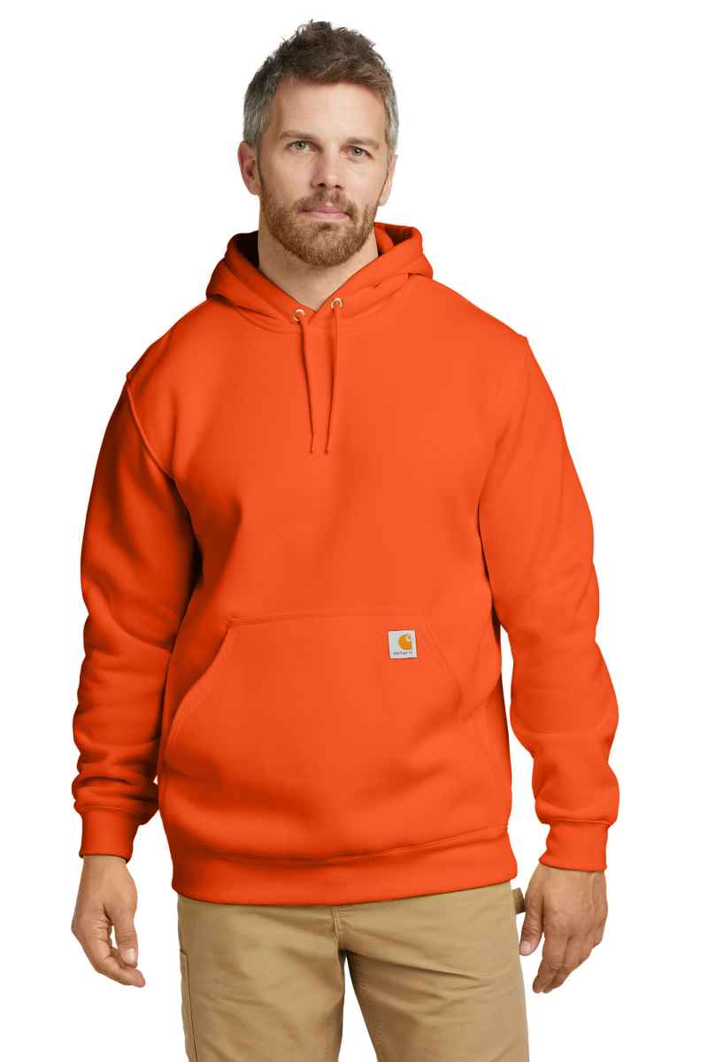 Sometimes Mother Nature can't make up her mind. This sweatshirt works perfectly as a layer or by itself, allowing you to adapt with the weather. 10.5-ounce, 50/50 cotton/poly blend or 59/41 cotton/poly blend (Black, Carbon Heather, Moss, New Navy)* 50/50 cotton/poly blend (Brite Lime, Brite Orange) 70/30 cotton/poly blend (Heather Grey) Attached three-piece hood with drawcord closure Front hand warmer pocket Stretchable, spandex-reinforced, rib knit cuffs and waistband Carhartt-strong, triple-stitched main seams Carhartt label sewn on hand warmer pocket Loose fit *Please note: Select colors in Carhartt fleece are currently transitioning from a 50/50 cotton/poly blend to a 59/41 cotton/poly blend. Weight and fabric properties remain the same. Your order may contain a combination of both fabrics.