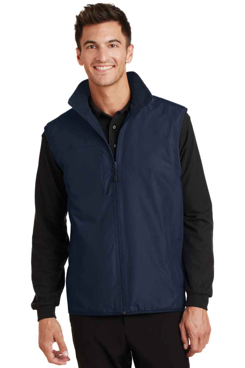 The versatile Challenger Vest has spandex-trimmed armholes and hem for long-wearing durability. | 100% Teklon® nylon shell 8.3-ounce, 100% polyester fleece body lining Double-needle stitching throughout Slash zippered pockets Port Pocket for easy embroidery access Binding at armholes and hem