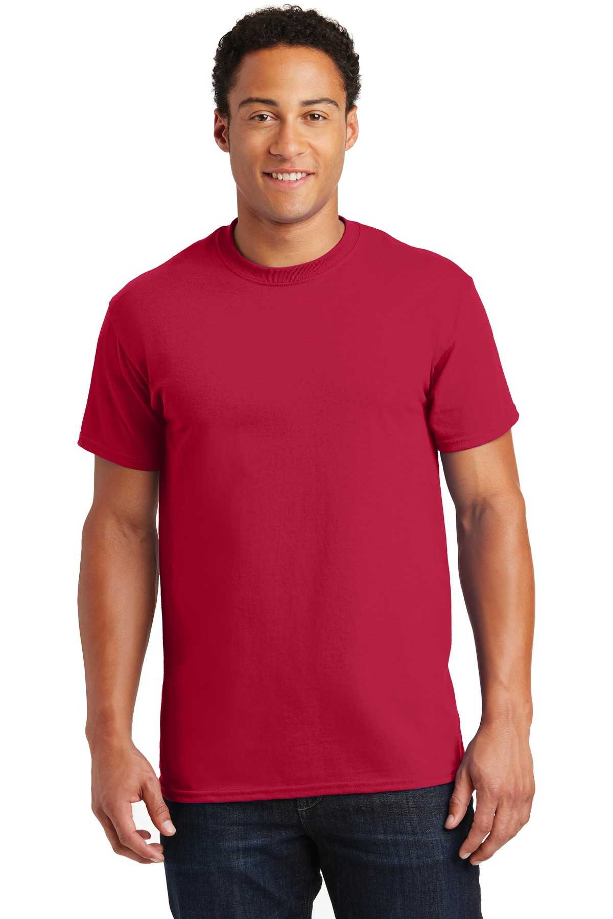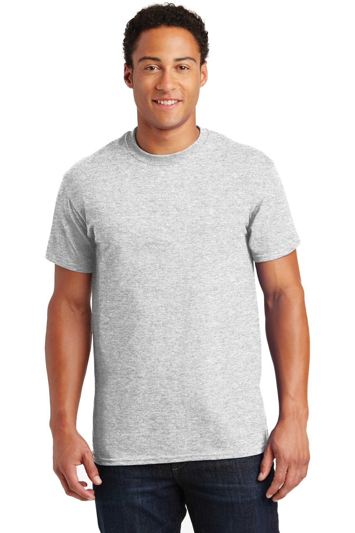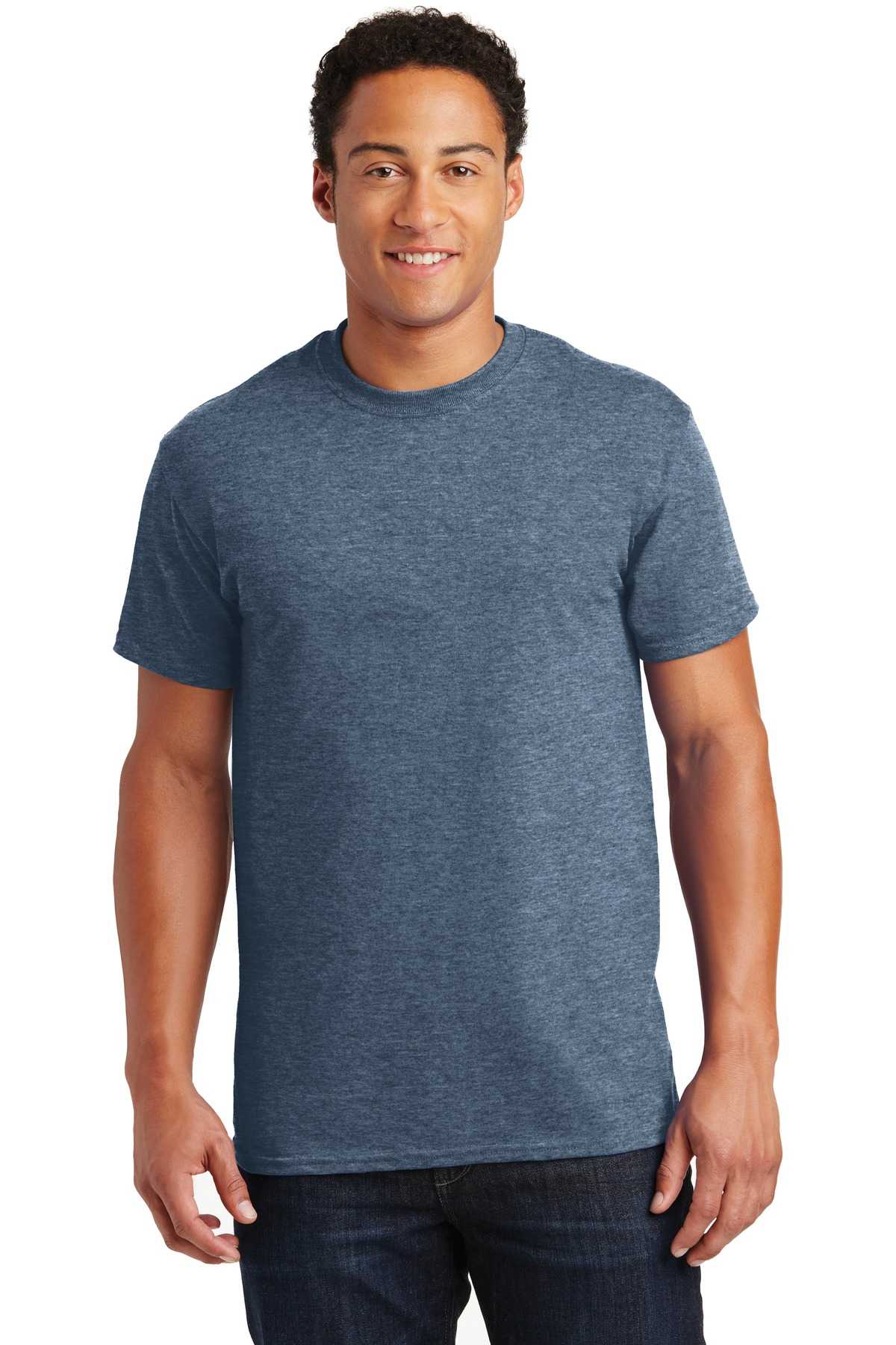 | 6-ounce, 100% US cotton) 50/50 cotton/poly (Dark Heather, Safety Pink, Safety Green, Safety Orange, Heathered Cardinal, Heathered Indigo, Heathered Navy, Heathered Sapphire) 99/1 cotton/poly (Ash) 90/10 cotton/poly (Sports Grey, Antique Cherry Red, Antique Irish Green, Antique Royal) Prepared for dying (PFD) fabric which means there are no starches, sizing or finishes on the fabric Non-topstitched, classic width, rib collar Taped neck and shoulders Classic fit, seamless body Recycled, high-performing black tear-away label Please note: This product is transitioning from tear-away labels to recycled, high-performing black tear-away labels. Your order may contain a combination of both labels.