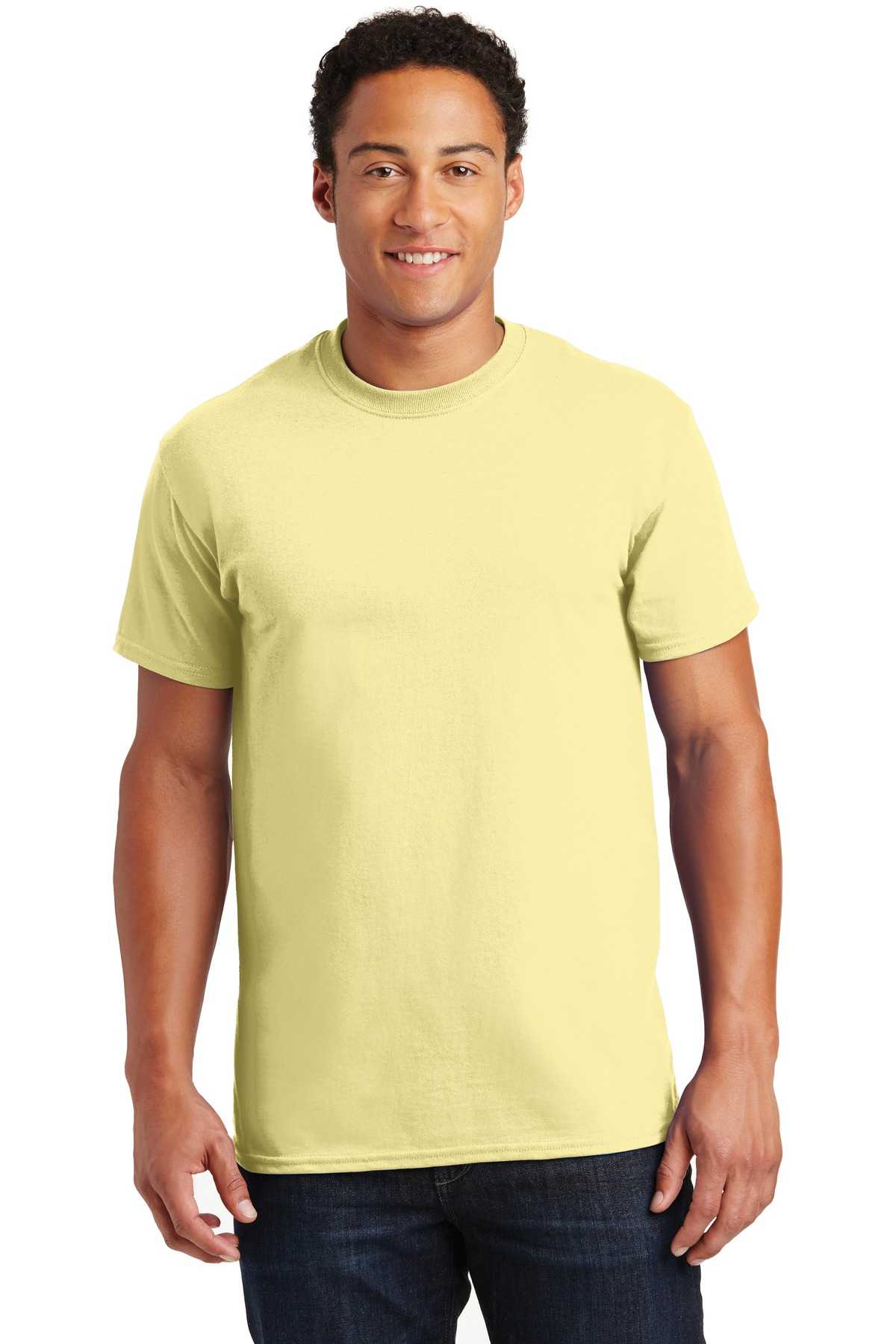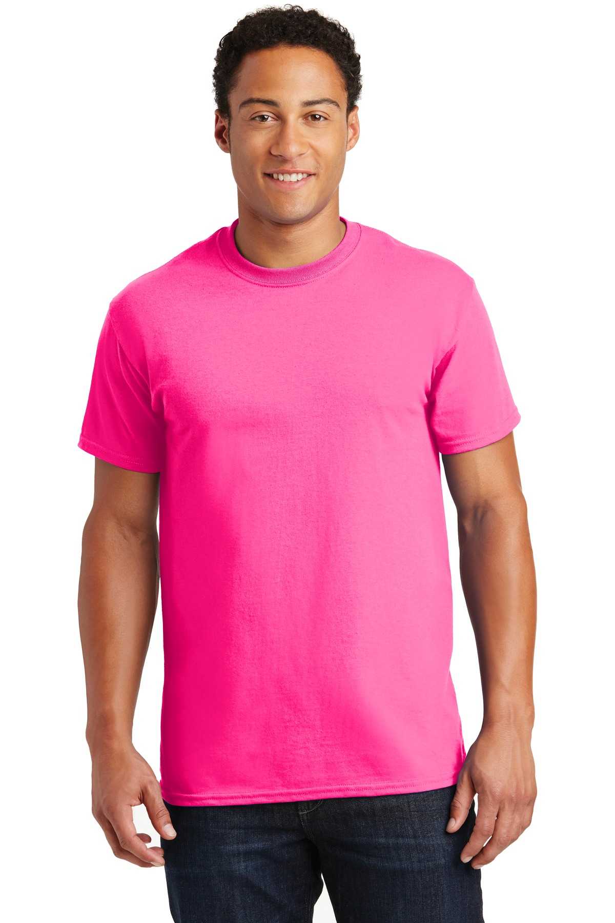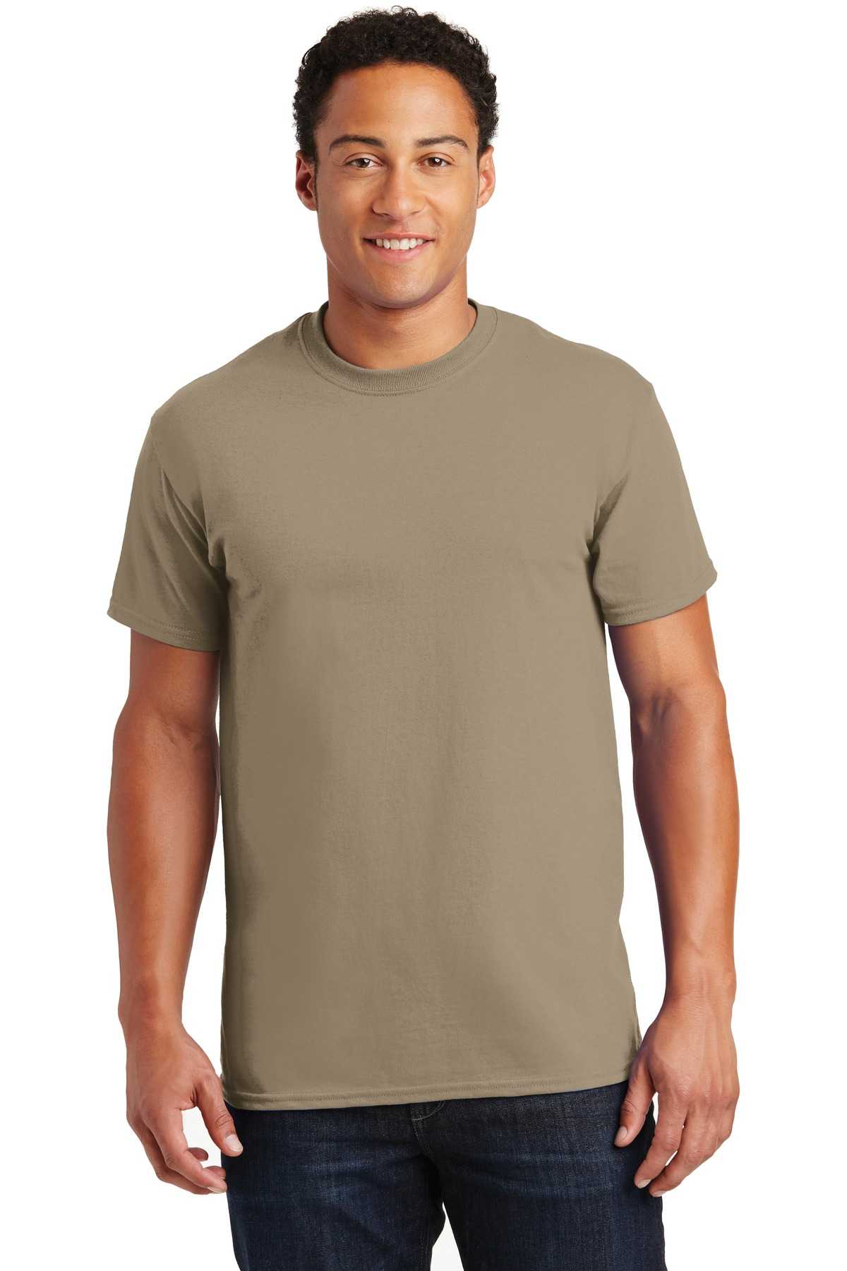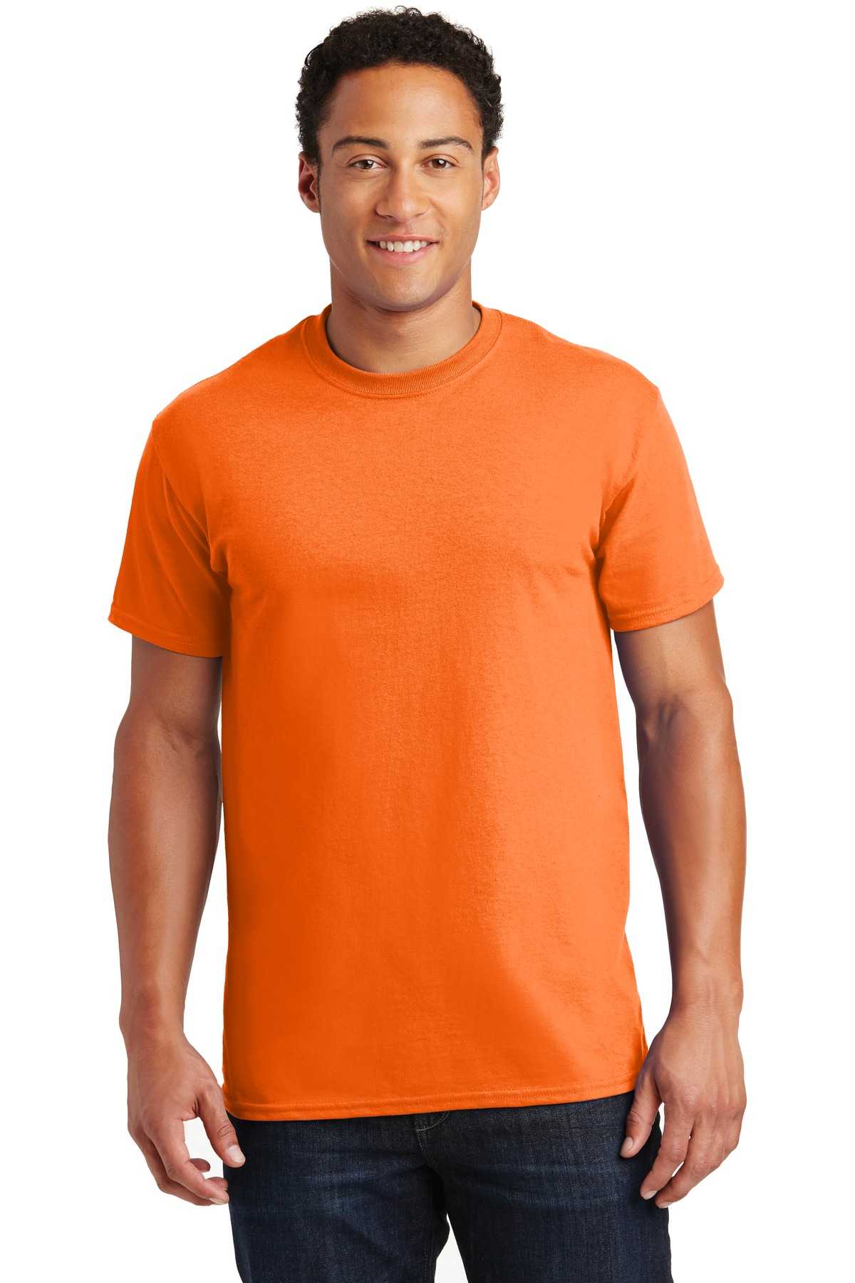 | 6-ounce, 100% US cotton) 50/50 cotton/poly (Dark Heather, Safety Pink, Safety Green, Safety Orange, Heathered Cardinal, Heathered Indigo, Heathered Navy, Heathered Sapphire) 99/1 cotton/poly (Ash) 90/10 cotton/poly (Sports Grey, Antique Cherry Red, Antique Irish Green, Antique Royal) Prepared for dying (PFD) fabric which means there are no starches, sizing or finishes on the fabric Non-topstitched, classic width, rib collar Taped neck and shoulders Classic fit, seamless body Recycled, high-performing black tear-away label Please note: This product is transitioning from tear-away labels to recycled, high-performing black tear-away labels. Your order may contain a combination of both labels.