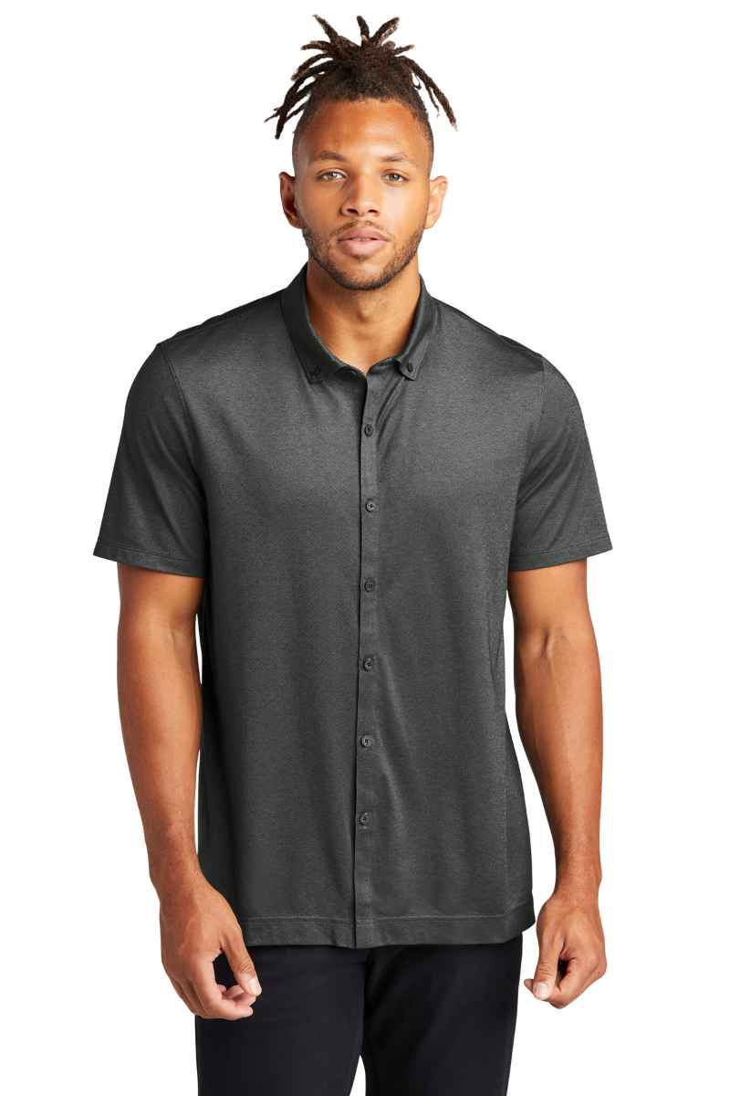 Combining the smart tailoring of a woven shirt with the movement and comfort of a soft knit, this shirt eases between night and day. The polished silhouette complements office wear, while the moisture-wicking fabric make it perfect for post-work play. A back yoke seam notched vent hem, and satin-finished buttons extend the contemporary profile. Fabric+Weight 5.5-ounce, 55/40/5 cotton/poly/spandex diamond pique Features+Benefits Moisture-wicking Self-fabric, button-down collar Rimmed, black satin-finished buttons (White buttons on white) Back yoke Self-turned cuffs and hem Notched vents