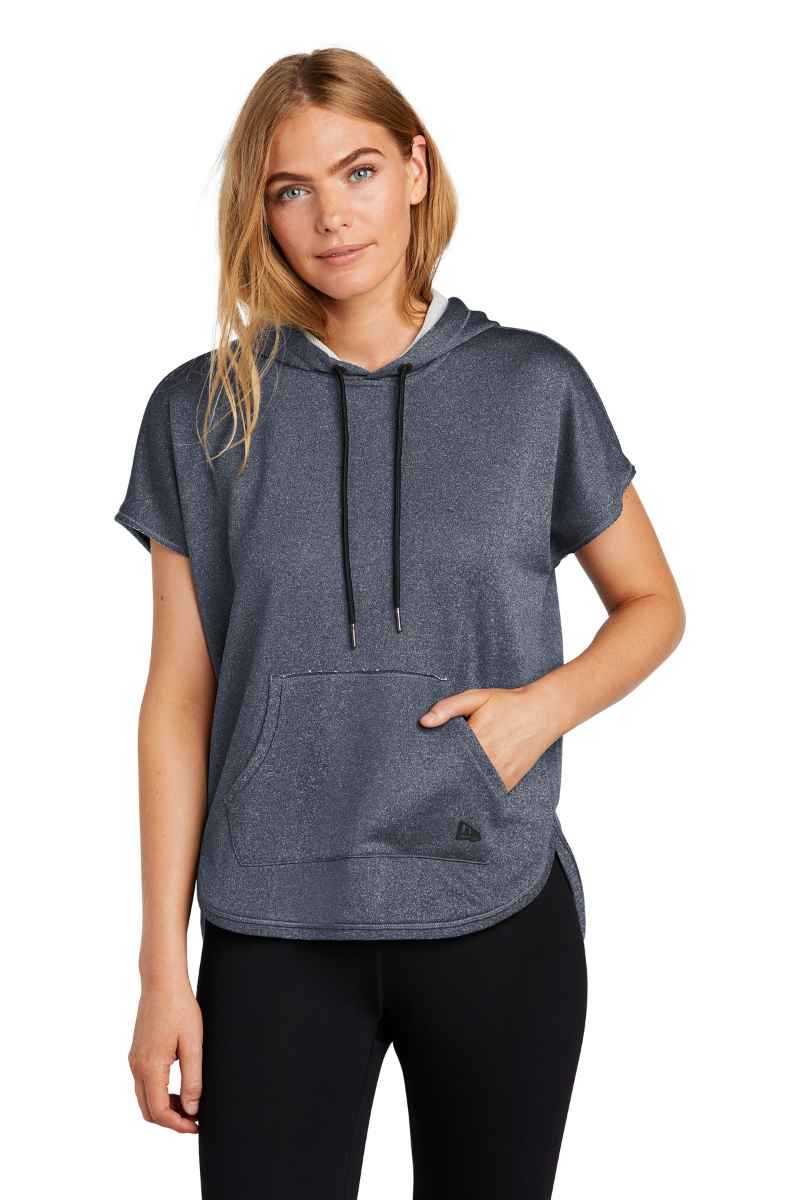 The cut-off sleeves give this hoodie a retro athletic look. 6.5-ounce, 100% polyester French terry 3-panel hood Heat transfer label for tag-free comfort Round drawcords with New Era metal tips Dolman sleeves with raw edge Black mesh detail underneath the sleeves Front pouch pocket Embossed silicone New Era flag logo on pocket Drop tail hem