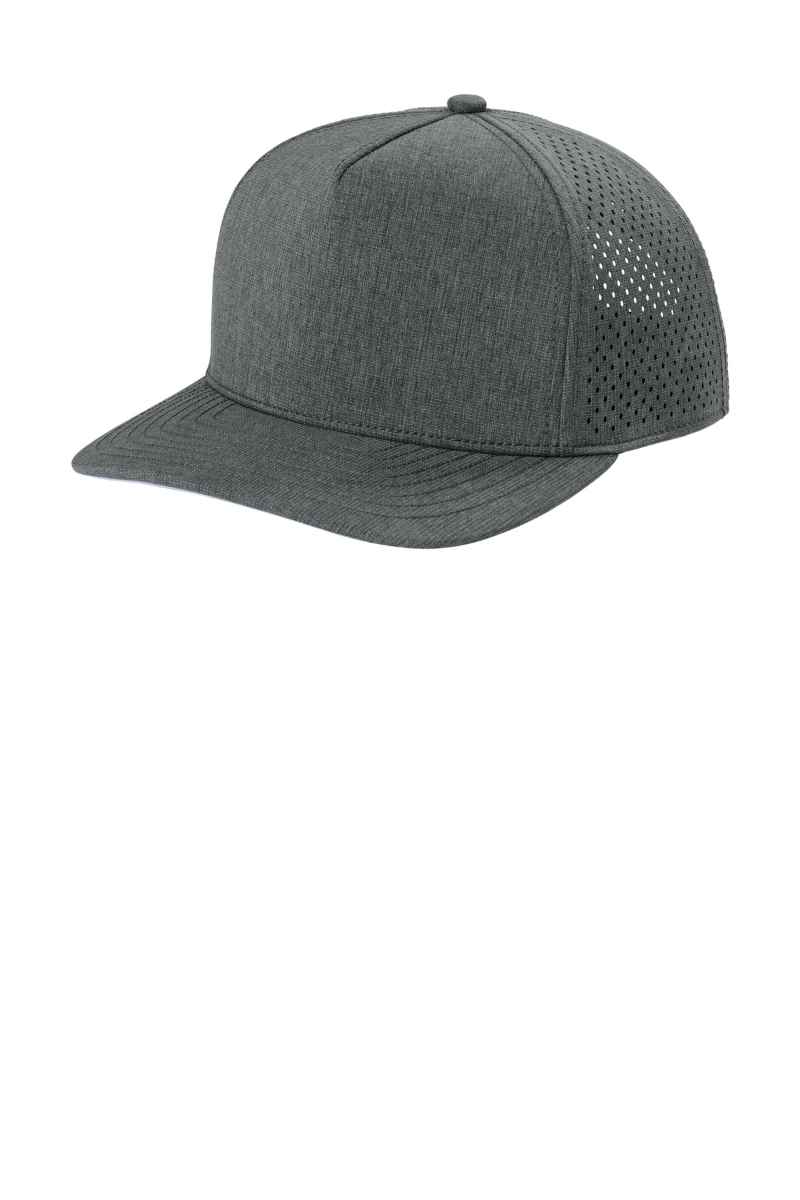 This cap combines performance features with the look of a traditional trucker. 94/6 polyester/spandex micro ripstop 100% polyester brushed twill underbill Gusty grey underbill Durable water repellent (DWR) finish helps keep cap afloat in water 5-panel with curved bill Moisture-wicking sweatband and front panel lining Breathable oval pattern perforation in mid and back panels Structured Low-profile 7-position adjustable snapback closure Matte black silicone O icon at left of keyhole