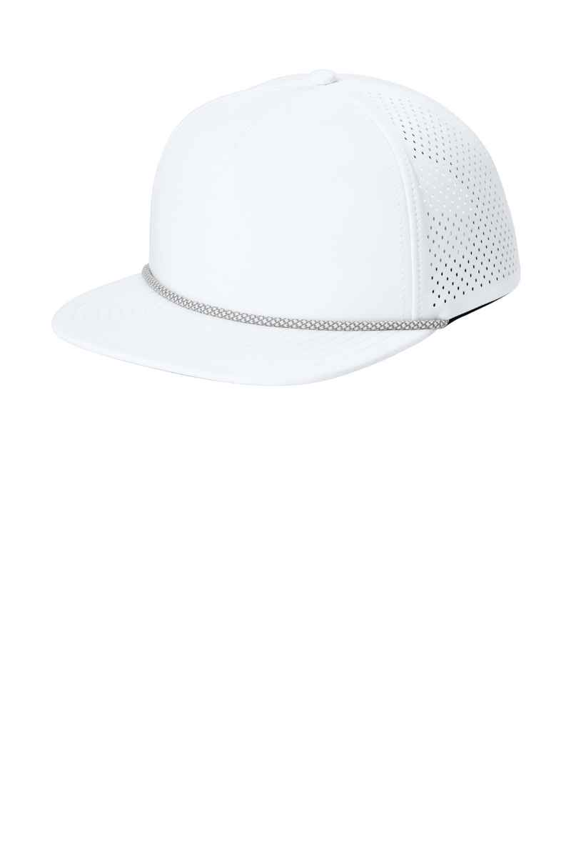 With its two-tone white/grey rope, this cap combines performance features with a retro look and feel. 94/6 polyester/spandex micro ripstop 100% polyester brushed twill underbill Gusty grey underbill Two-toned white/grey rope Durable water repellent (DWR) finish helps keep cap afloat in water 5-panel with flat bill Moisture-wicking sweatband and front panel lining Breathable oval pattern perforation in mid and back panels Lightly structured with lined mesh flap on interior front panel Low-profile 7-position adjustable snapback closure Matte black silicone O icon at left of keyhole