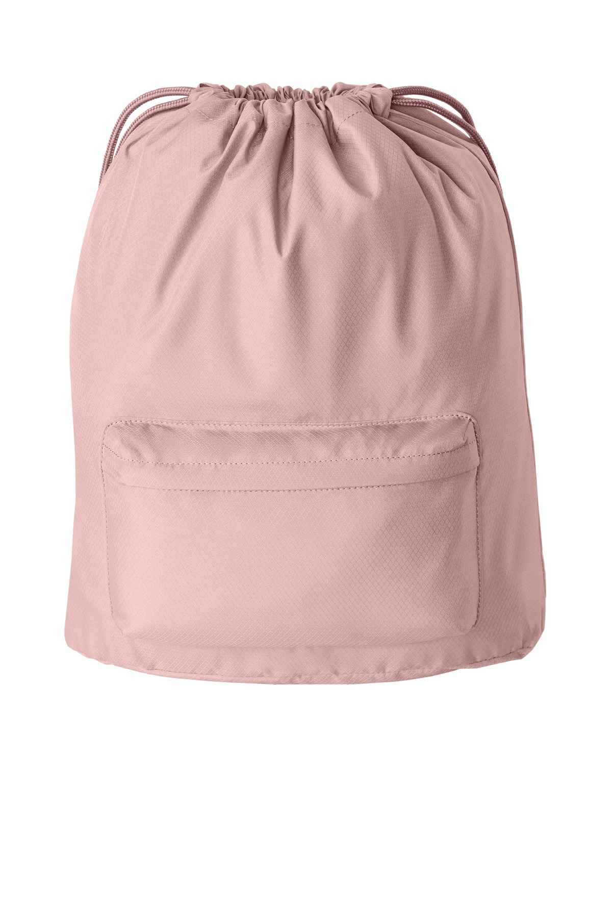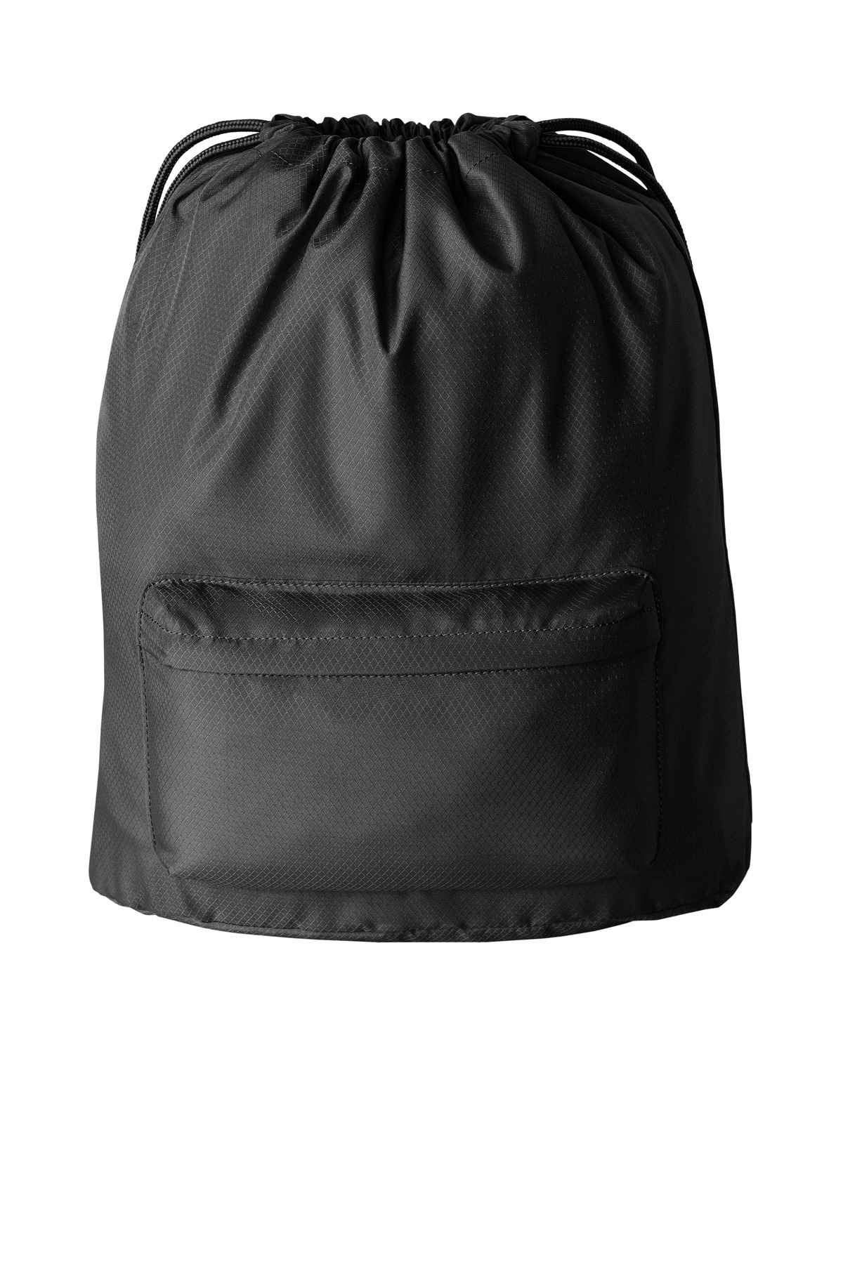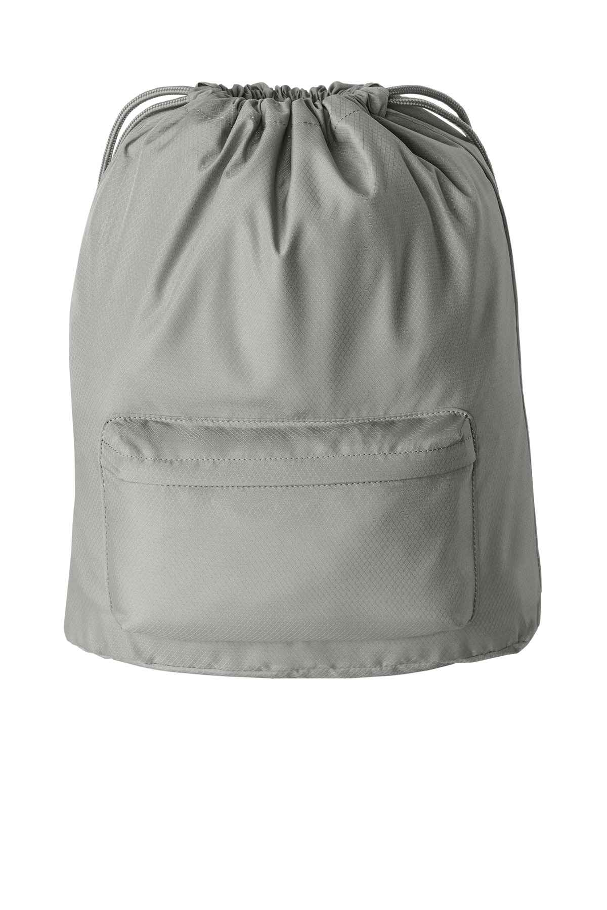 150D matte diamond polyester Dyed-to-match drawcord closure Adjustable dyed-to-match web straps Front zippered pocket Dyed-to-match hardware Bottom base helps cinch remain upright when placed on the ground Dimensions: 18'h x 13.75'w x 6.5'd Capacity: 1,324.5 cu. in./22 L Weight: 0.4 lbs./0.18 kg Note: Bags not intended for use by children 12 and under.