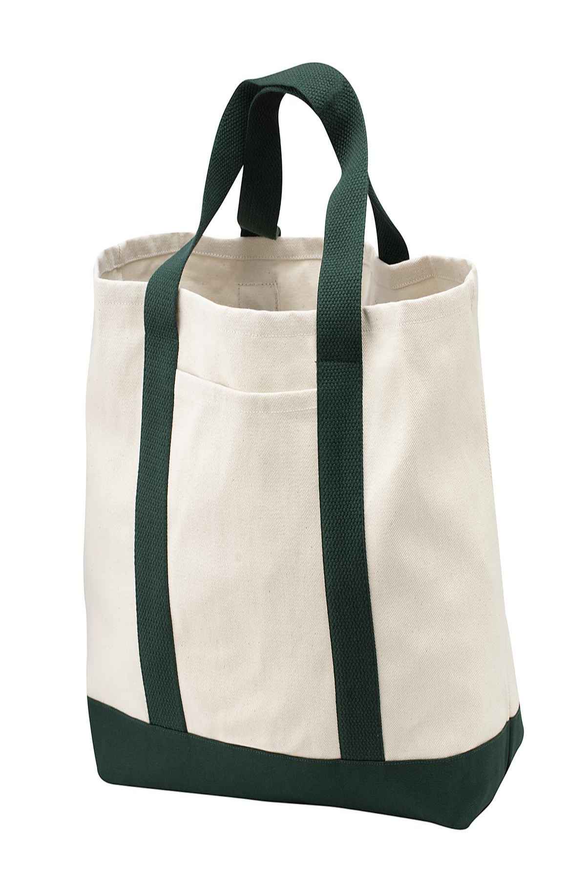 Carry necessities with a touch of traditional style. | Durable 10-ounce, 100% cotton twill, contrast canvas bottom Deep exterior pocket for easy decoration Polyester web handles Dimensions: 14' h x 14.5' w x 5.5' d; Approx. 1,117 cubic inches Note: Bags not intended for use by children 12 and under. Includes a California Prop 65 and social responsibility hangtag.