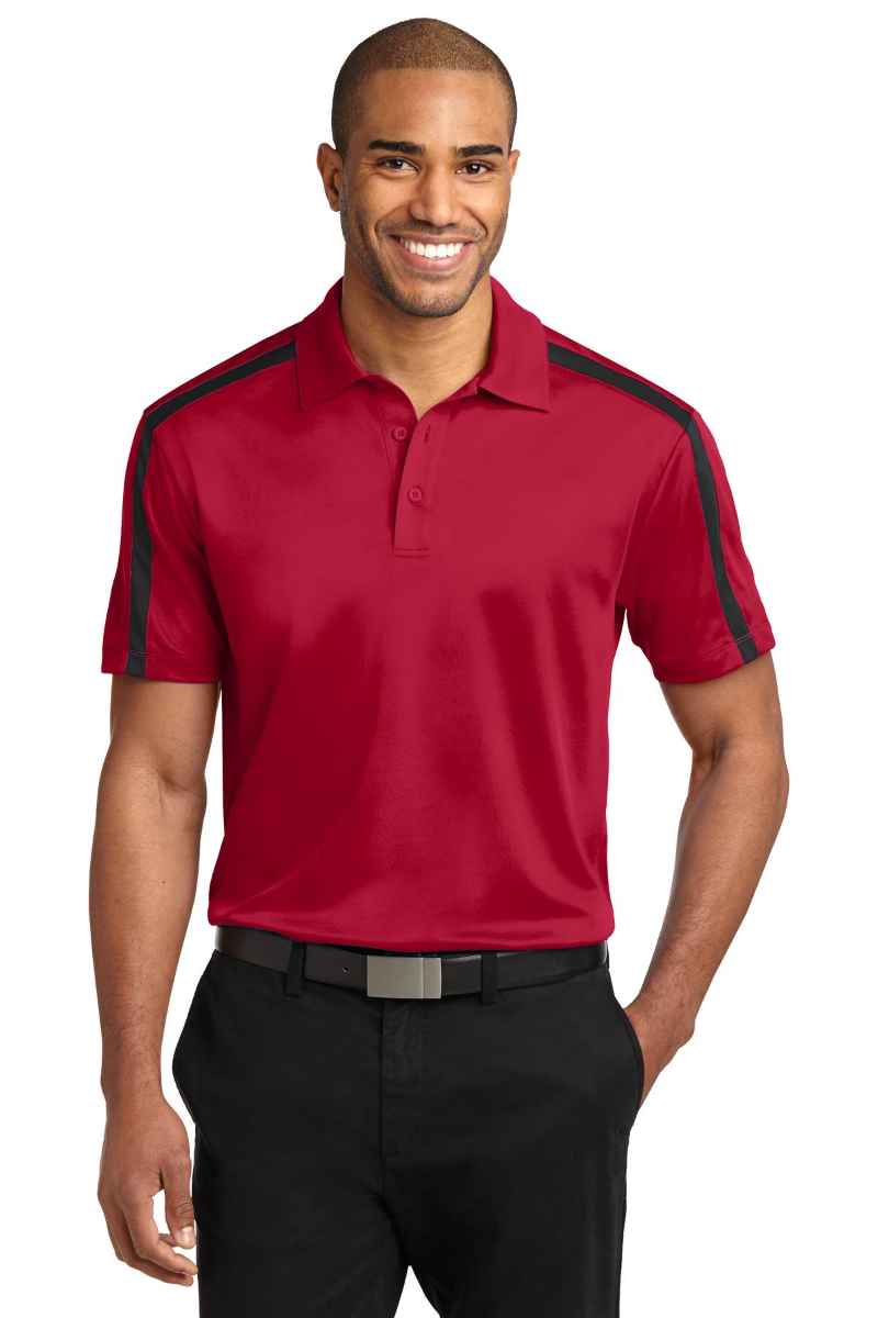 A stripe on the front, back, shoulders and sleeves adds bold contrast to our high-performance polo that wicks moisture and resists snags. PosiCharge ® technology delivers exceptional colorfastness and optimal printability. | 4-ounce, 100% polyester double knit with PosiCharge technology; White is 4.3-ounce for increased coverage Self-fabric collar Tag-free label 3-button placket with dyed-to-match buttons Open hem sleeves