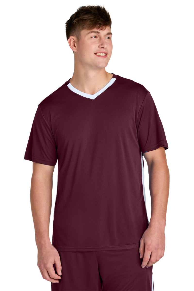 Top off your game with this Competitor United V-neck that features moisture wicking and sun protection. 3.8-ounce, 100% poly interlock with PosiCharge ® technology UPF rating of 30+ Tear-away label Athletic V-neck Contrast colorblocking at neck and side