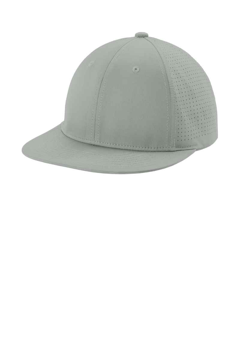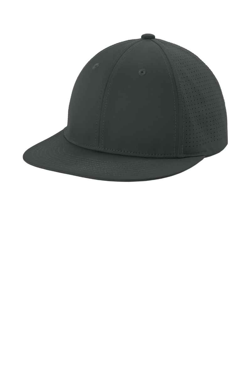 96/4 polyester/spandex Moisture-wicking Stretch-Tek sweatband technology for a comfortable fit Moisture-wicking fabric Laser cut ventilation in mid and back panels for breathability Flat bill with Pro-Cut sticker Iron Grey undervisor Sport-Tek branded taping Structured Mid-profile Stretch fit
