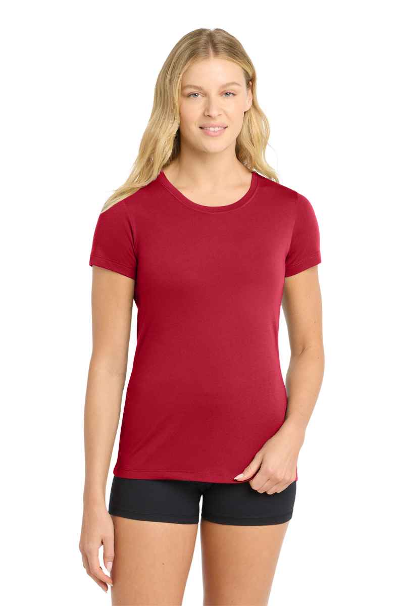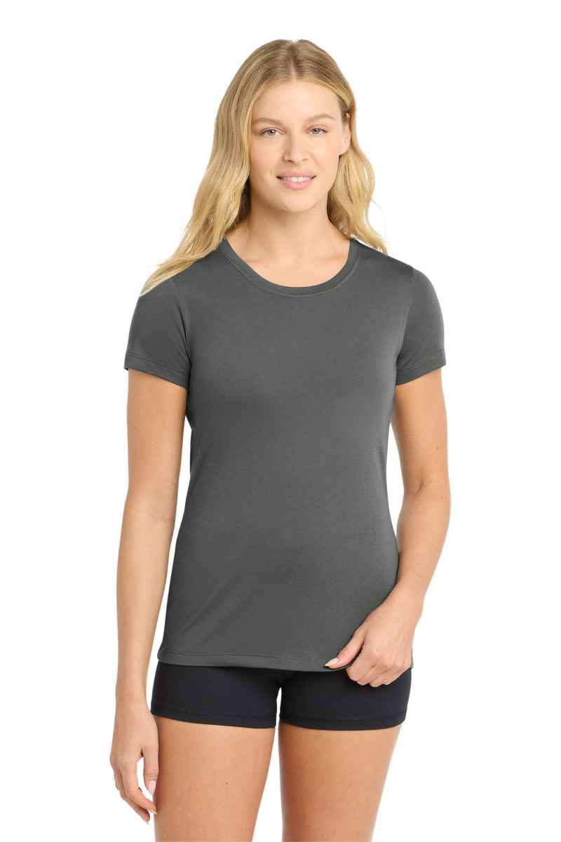 A soft cotton hand merges with color-locking, moisture-wicking performance in this tee that also has a matte finish. 4.7-ounce, 100% spun polyester jersey with PosiCharge technology Soft cotton hand Removable tag for comfort and relabeling Dyed-to-match neck taping Set-in sleeves