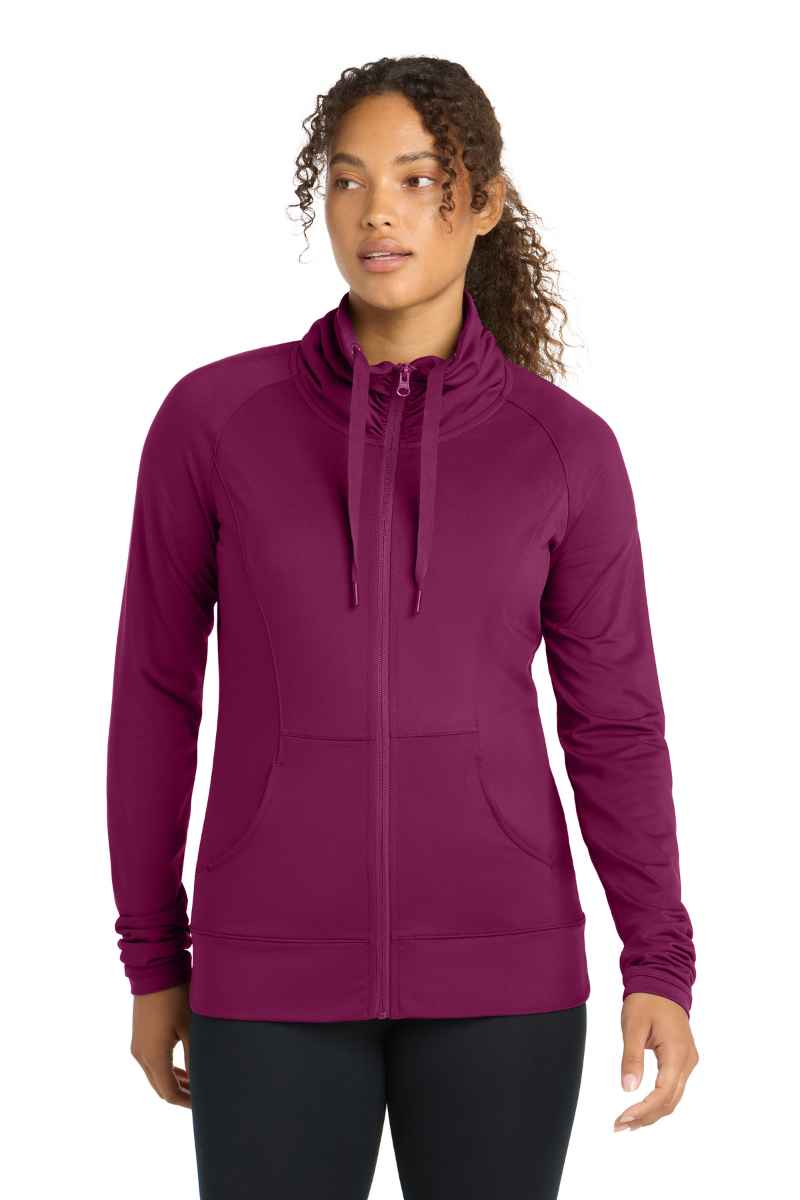 A stretchy, moisture-wicking performance jacket with a soft-brushed backing and unique cowl collar. | 6.8-ounce, 90/10 poly/spandex jersey Tag-free label Zip-through cowl collar with ruching Dyed-to-match drawcord Dyed-to-match Sport-Tek ® logo neck taping Reverse coil zipper Raglan sleeves Front pouch pockets Ruching at cuffs Self-fabric hem