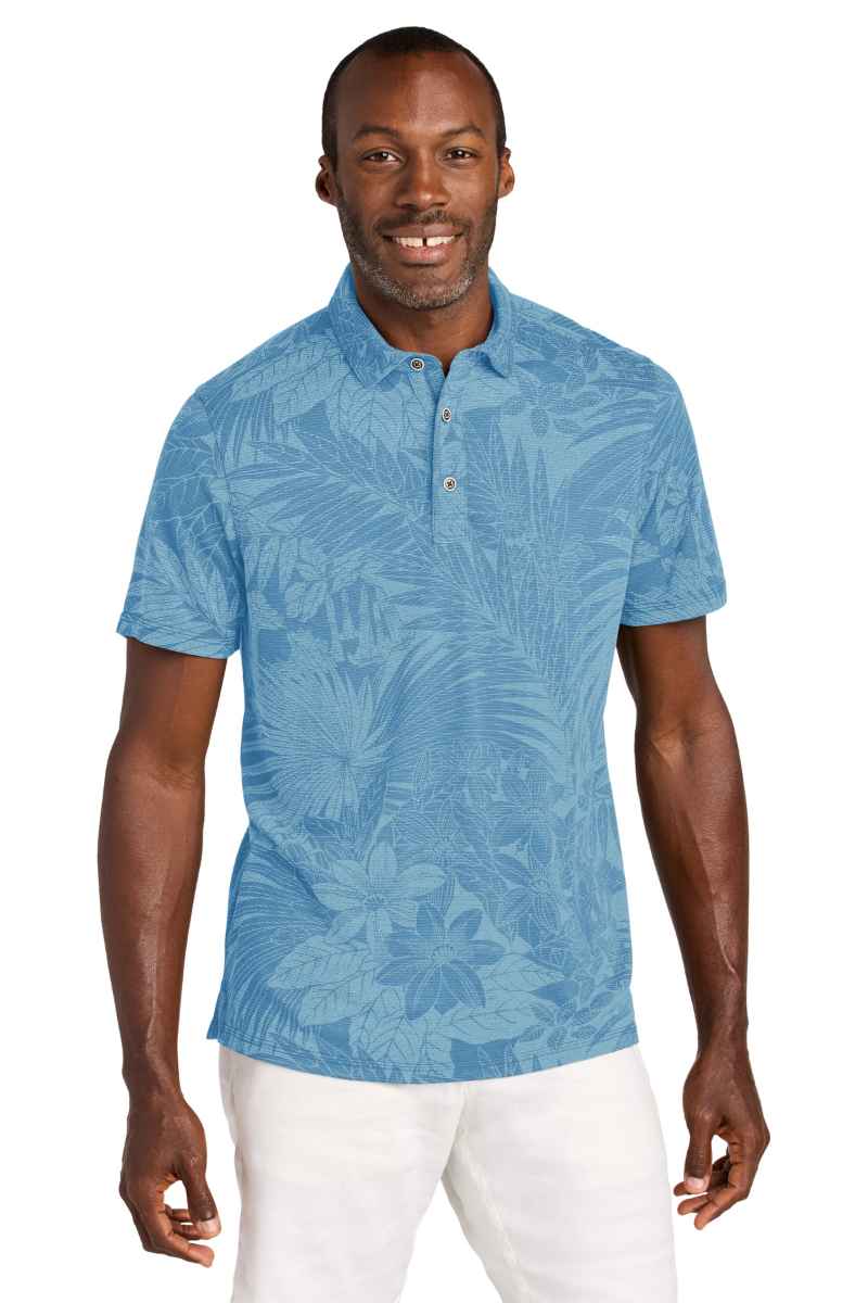 A sublimated tropical print instantly transports you to the islands in this elevated polo. With its soft sandwashed finish and moisture-wicking performance, this timeless style makes a sophisticated statement in the office or while you're jet setting. 5.9-ounce, 60/40 Tencel Modal/recycled polyester Tonal embroidered Marlin logo at center back neck Woven Marlin logo tab at left side seam Self-fabric collar and placket Three-button placket Turned cuffs and hem with triple-stitching details Side vents