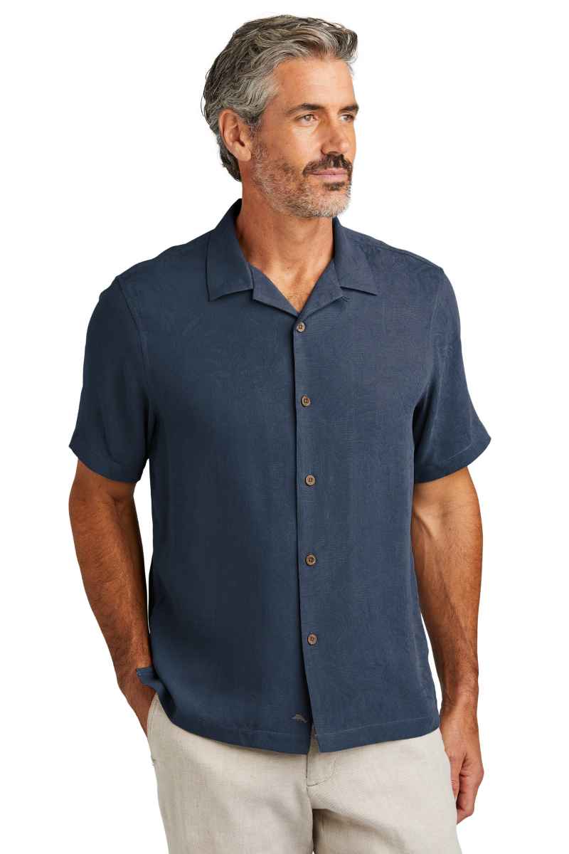 Woven from pure silk with a subtle tropical print, this light, breathable shirt transports you to an island state of mindâ¿¿because you deserve only the finest from sunup to sunset. 4.1-ounce, 100% soft silk jacquard Camp collar Straight hem with side vents Unique coconut buttons Marlin on inside placket above bottom hem