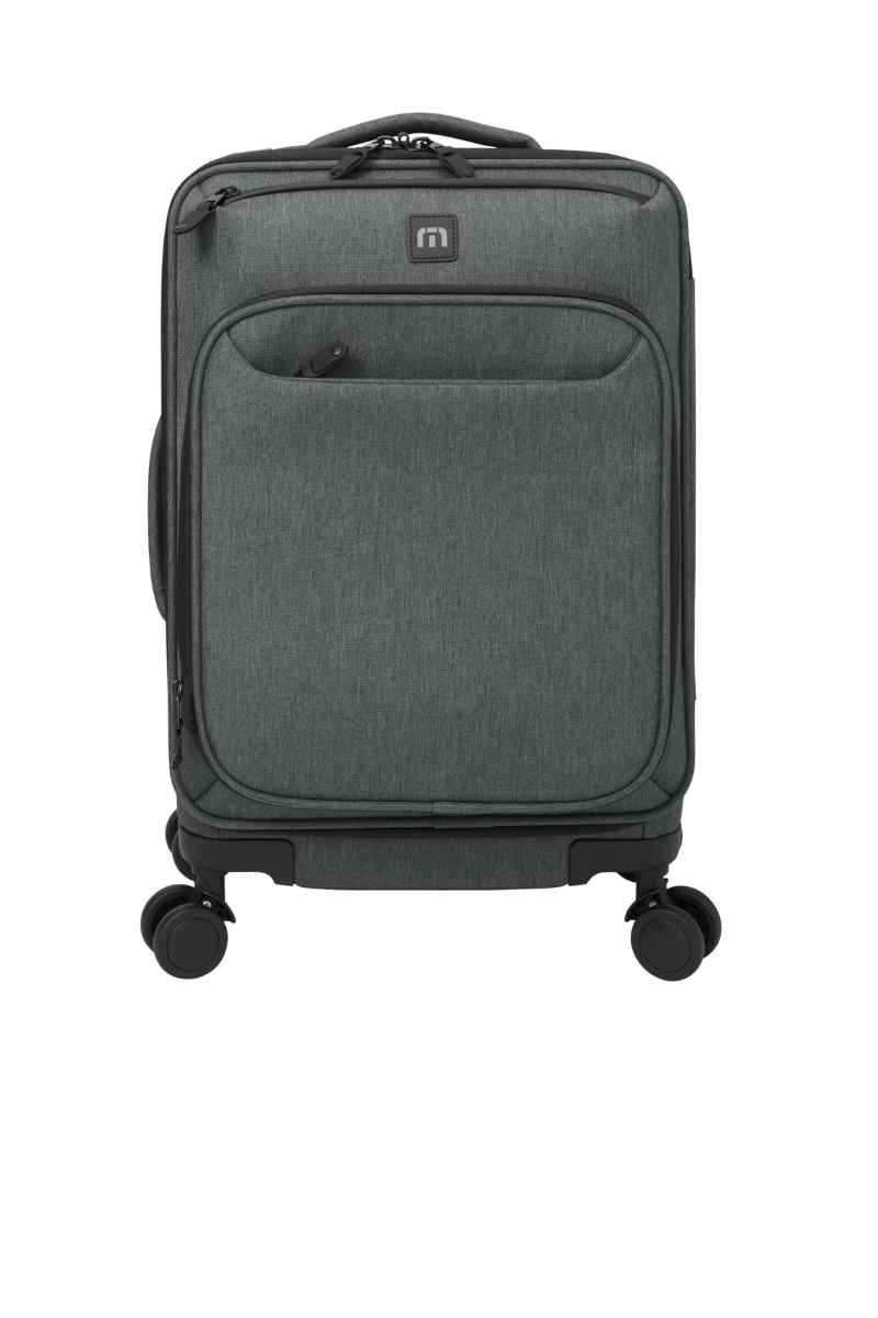 Start your trip off right with this spinner that can handle all your gear, whether you're heading to the beach or the mountains. 600D poly Durable water repellent (DWR) finish Molded back with embossed TM logo Top handle for quick grab and easy lifting Dedicated padded laptop compartment Zippered front pocket can be removed for ease of decoration Large main compartments with compression straps Padded side grab handle 4 spinning wheels for easy maneuvering and increased stability Locking retractable handle Rubberized TM logo Laptop sleeve dimensions: 14'h x 11'w x 1.5'd; fits most 16' laptops Dimensions: 22'h x 14'w x 10'd Capacity: 2.075 cu. in./34 L Weight: 10.6 lbs./4.8 kg Carry-on size (check airline for specific carry-on dimensions) Note: Bags not intended for use by children 12 and under.